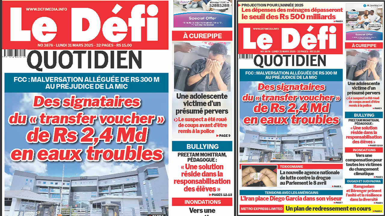 ? Voici la Une du Défi Quotidien. Le journal est en vente à Rs 15 l'exemplaire aux endroits habituels (supermarchés, boutiques, tabagies, superettes). Bonne lecture !