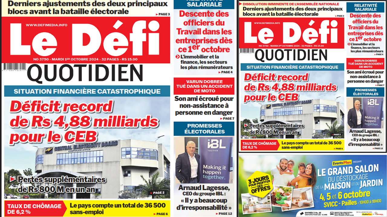 ? Voici la Une du Défi Quotidien. Le journal est en vente à Rs 15 l'exemplaire aux endroits habituels (supermarchés, boutiques, tabagies, superettes). Bonne lecture !