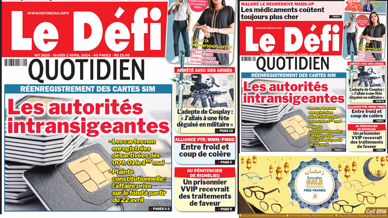? Voici la Une du Défi Quotidien. Le journal est en vente à Rs 15 l'exemplaire aux endroits habituels (supermarchés, boutiques, tabagies, superettes). Bonne lecture !