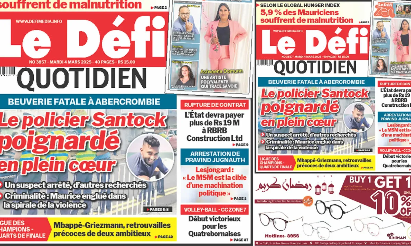? Voici la Une du Défi Quotidien. Le journal est en vente à Rs 15 l'exemplaire aux endroits habituels (supermarchés, boutiques, tabagies, superettes). Bonne lecture !