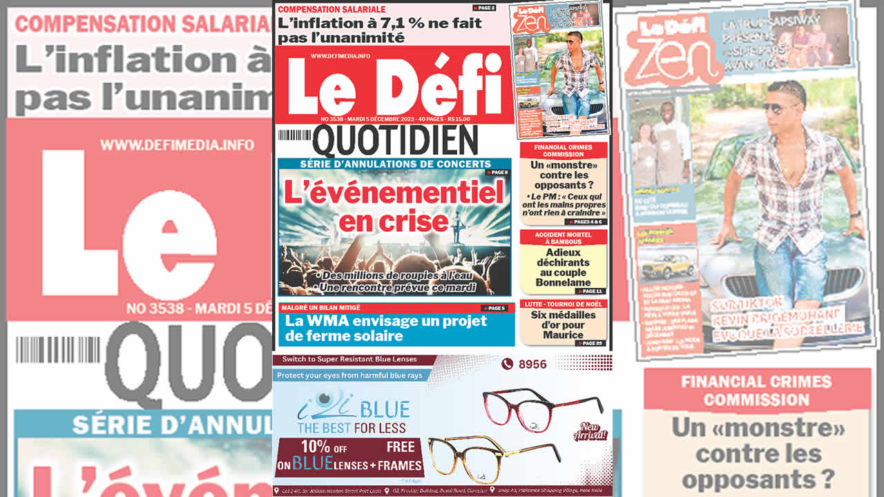 ? Voici la Une du Défi Quotidien. Le journal est en vente à Rs 15 l'exemplaire aux endroits habituels (supermarchés, boutiques, tabagies, superettes). Bonne lecture !