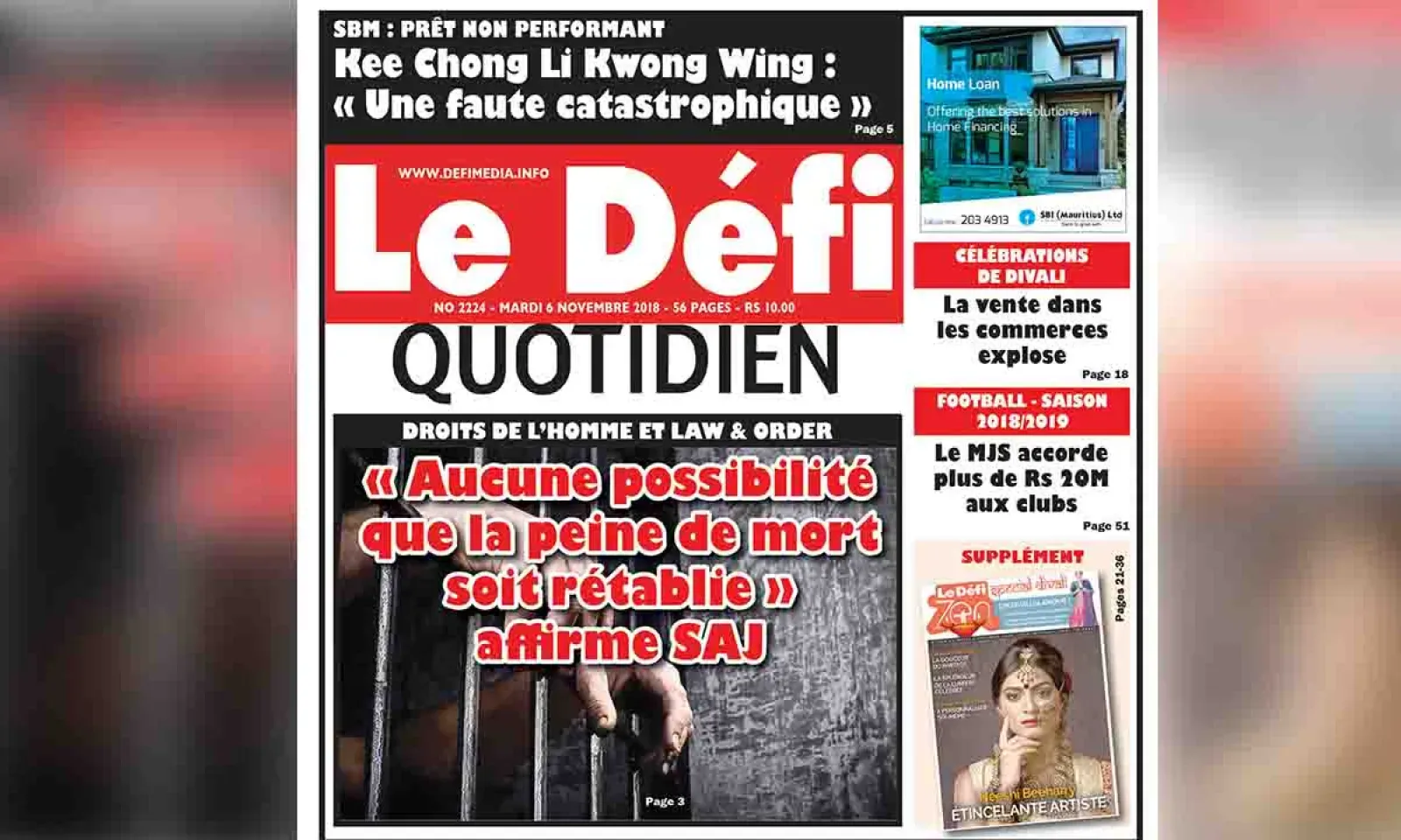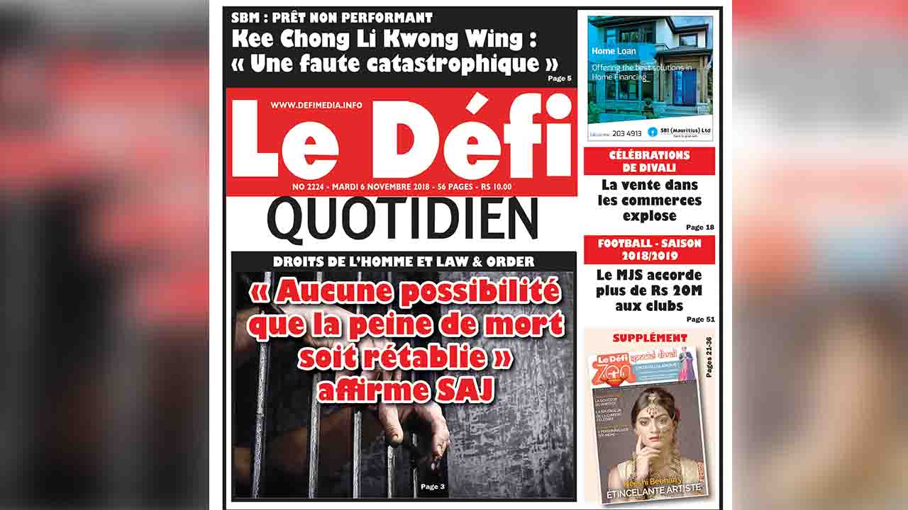 Voici la Une du Defi Quotidien de ce mardi 06 novembre 2018