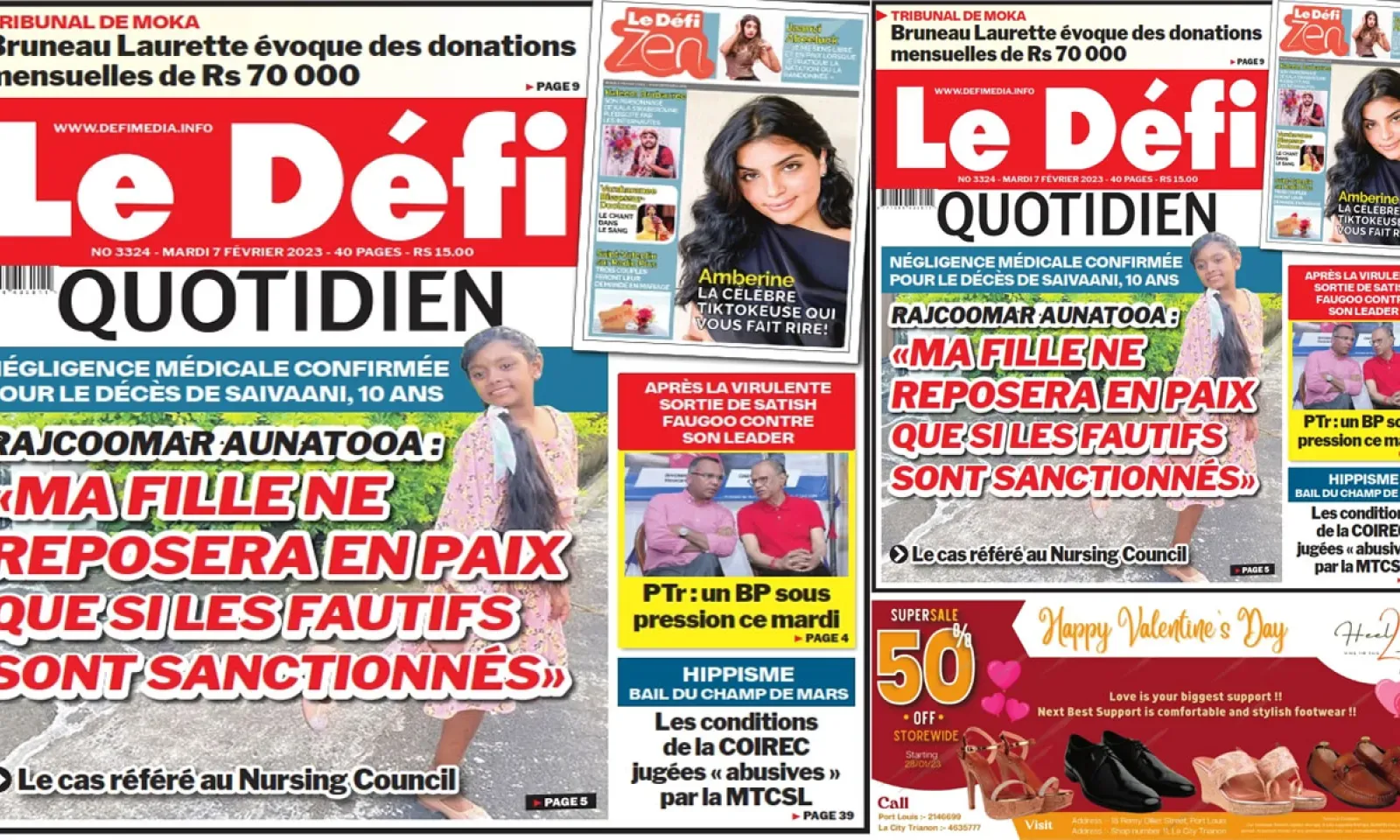 ? Voici la Une du Défi Quotidien. Le journal est en vente à Rs 15 l'exemplaire aux endroits habituels (supermarchés, boutiques, tabagies, superettes). Bonne lecture !