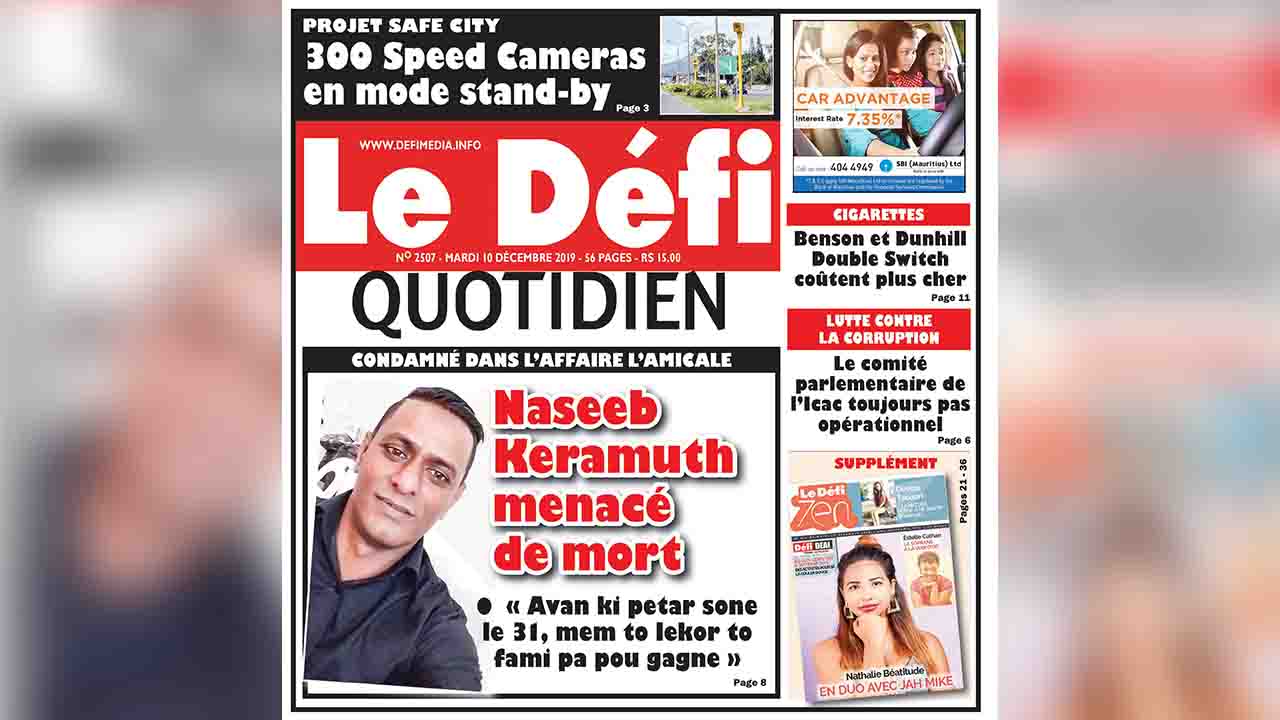 - Abdool Naseeb Keeramuth, l’un des quatre condamnés dans l’affaire Amicale, libéré le 23 août 2018, a porté plainte pour menace de mort, au poste de police de Plaine-Verte, le dimanche 8 décembre. « Avan ki petar soné le 31 mem to lekor to fami pa pou gagne pran tou to bann prekosyon », peut-on lire sur la deuxième lettre de menaces, reçue dimanche.