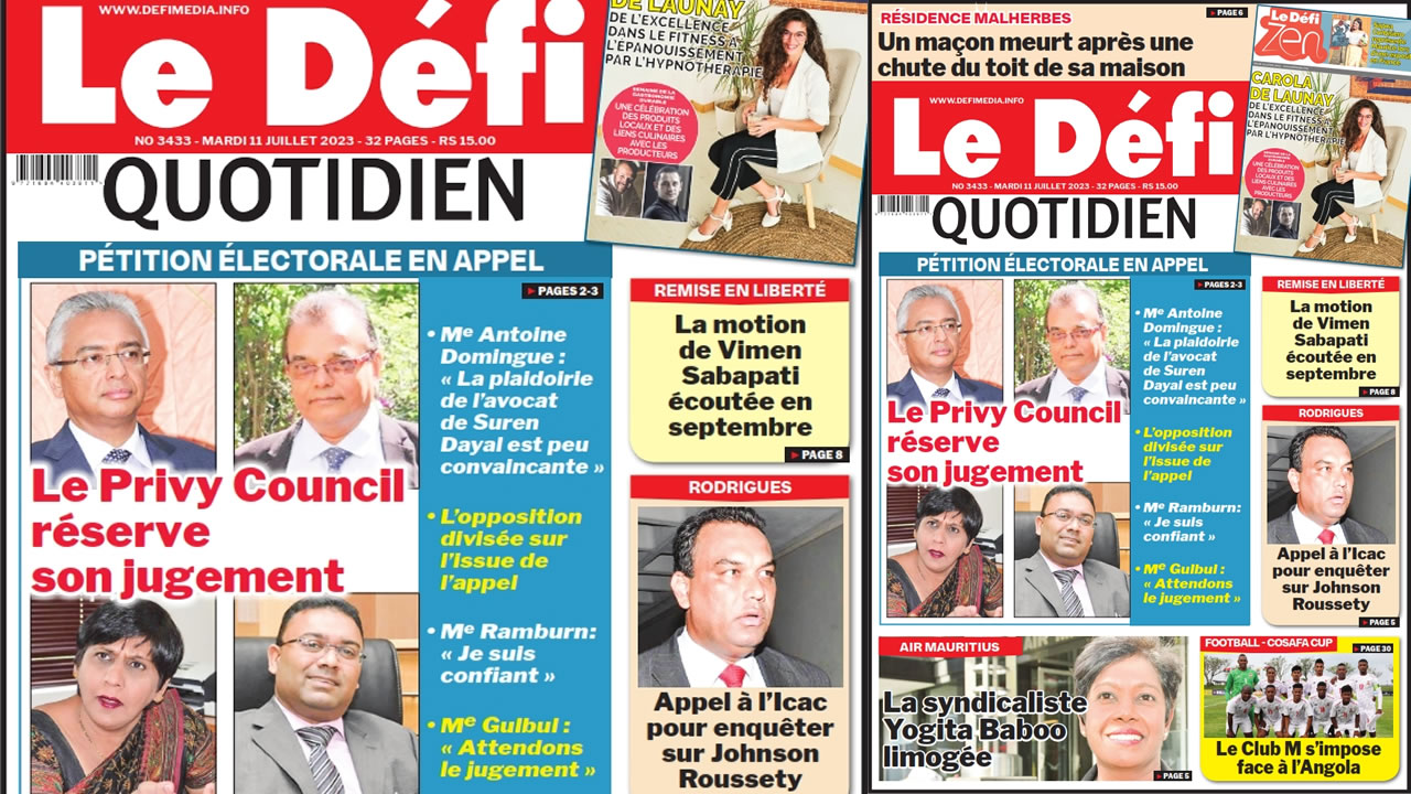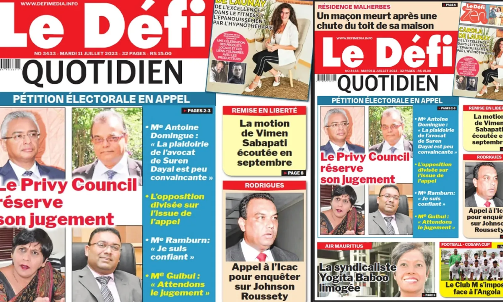 ? Voici la Une du Défi Quotidien. Le journal est en vente à Rs 15 l'exemplaire aux endroits habituels (supermarchés, boutiques, tabagies, superettes). Bonne lecture !