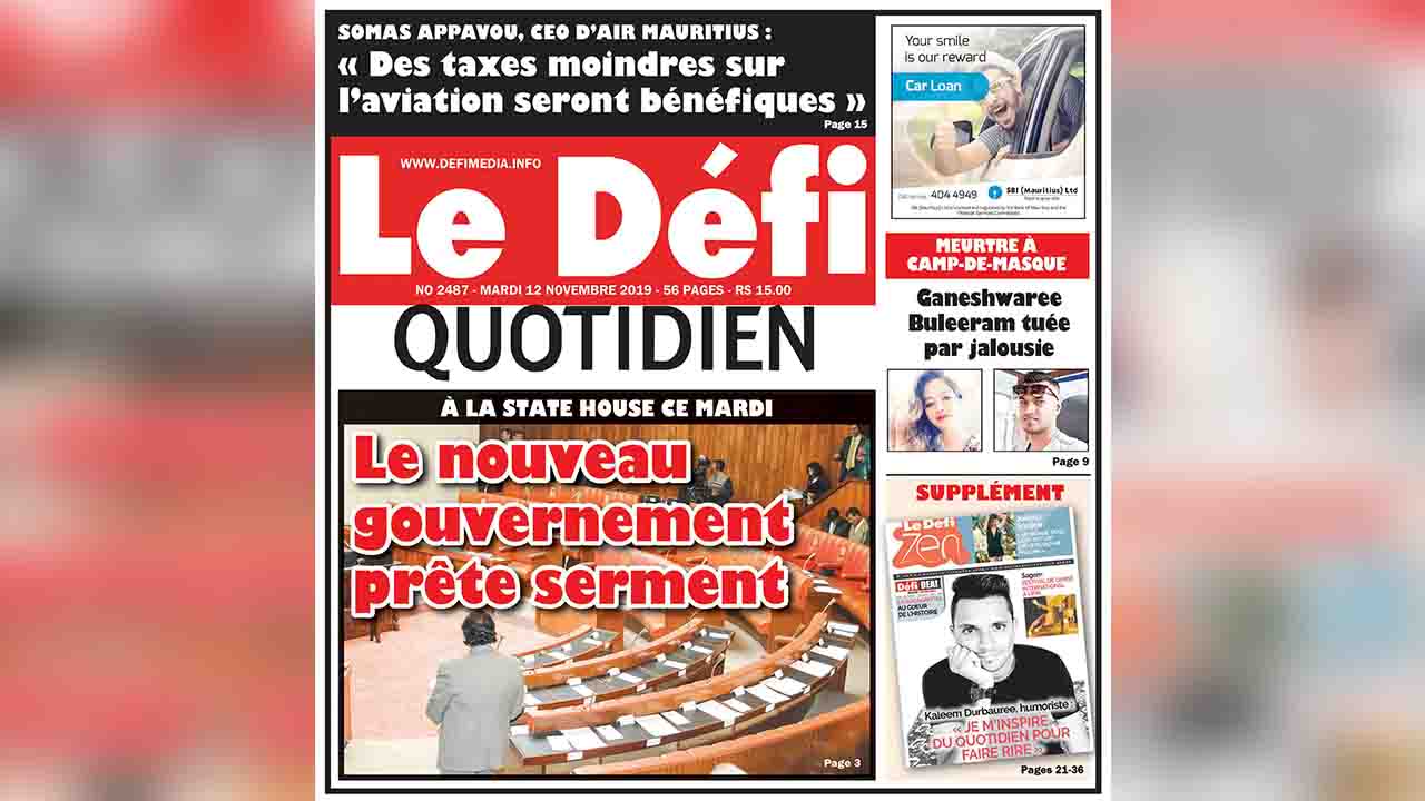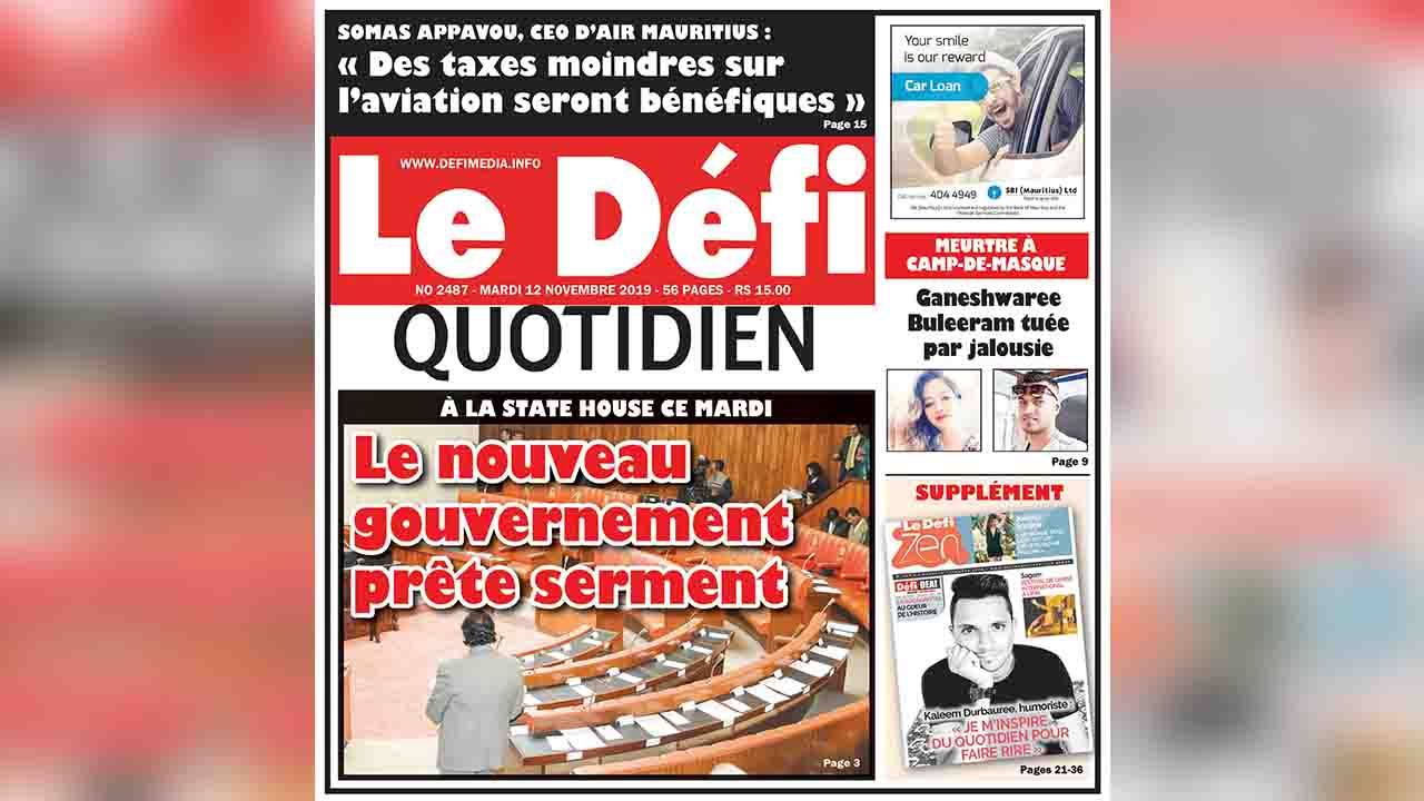 Voici la Une du Defi Quotidien de ce mardi 12 novembre 2019