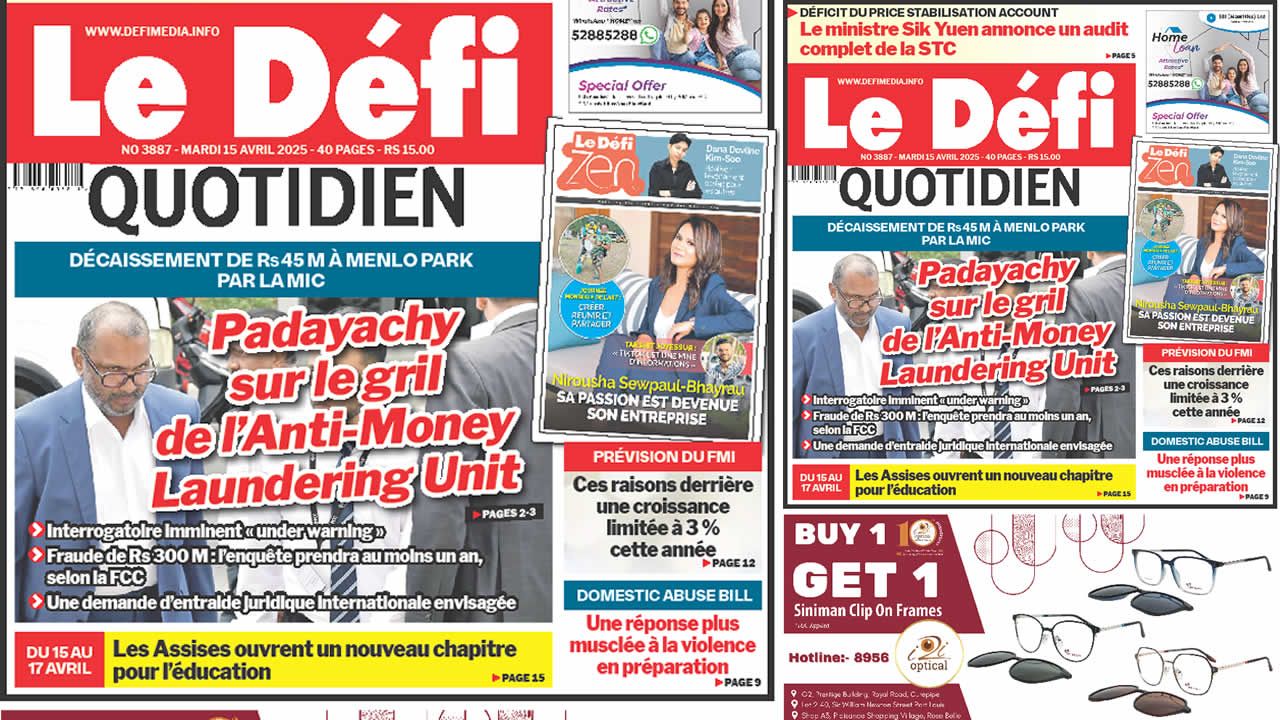 ? Voici la Une du Défi Quotidien. Le journal est en vente à Rs 15 l'exemplaire aux endroits habituels (supermarchés, boutiques, tabagies, superettes). Bonne lecture !