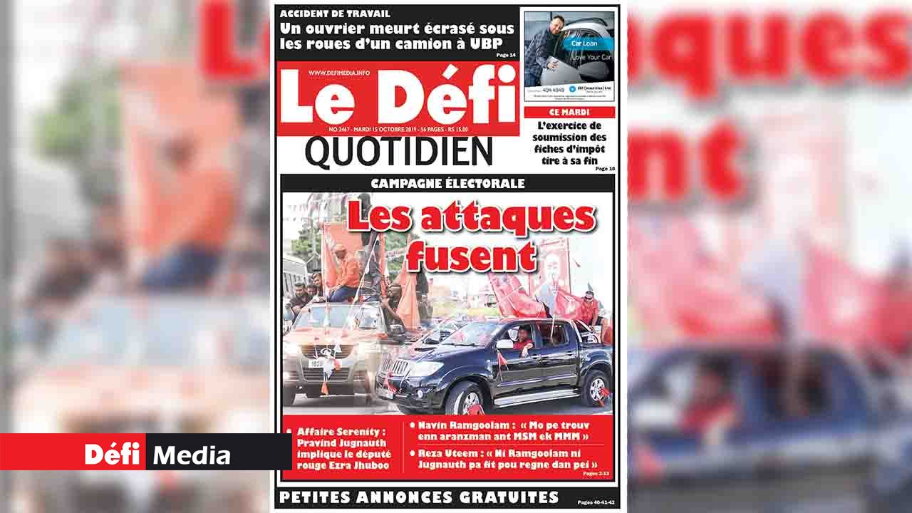 Voici la Une du Defi Quotidien de ce mardi 15 octobre 2019