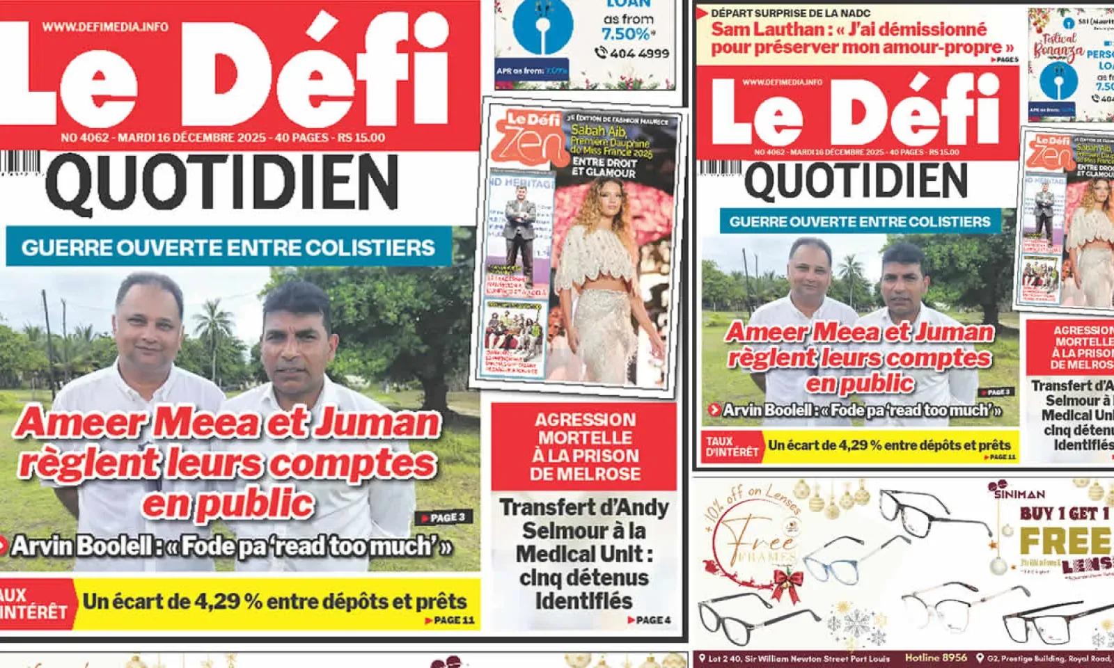 Voici la Une du Défi Quotidien. Le journal est en vente à Rs 15 l'exemplaire aux endroits habituels (supermarchés, boutiques, tabagies, superettes). Bonne lecture !