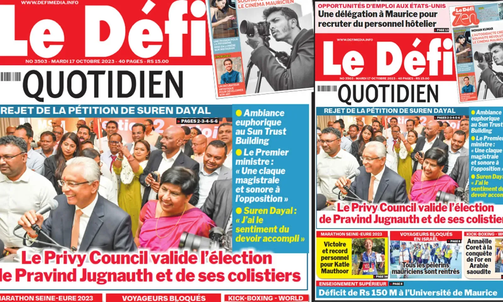 ? Voici la Une du Défi Quotidien. Le journal est en vente à Rs 15 l'exemplaire aux endroits habituels (supermarchés, boutiques, tabagies, superettes). Bonne lecture !