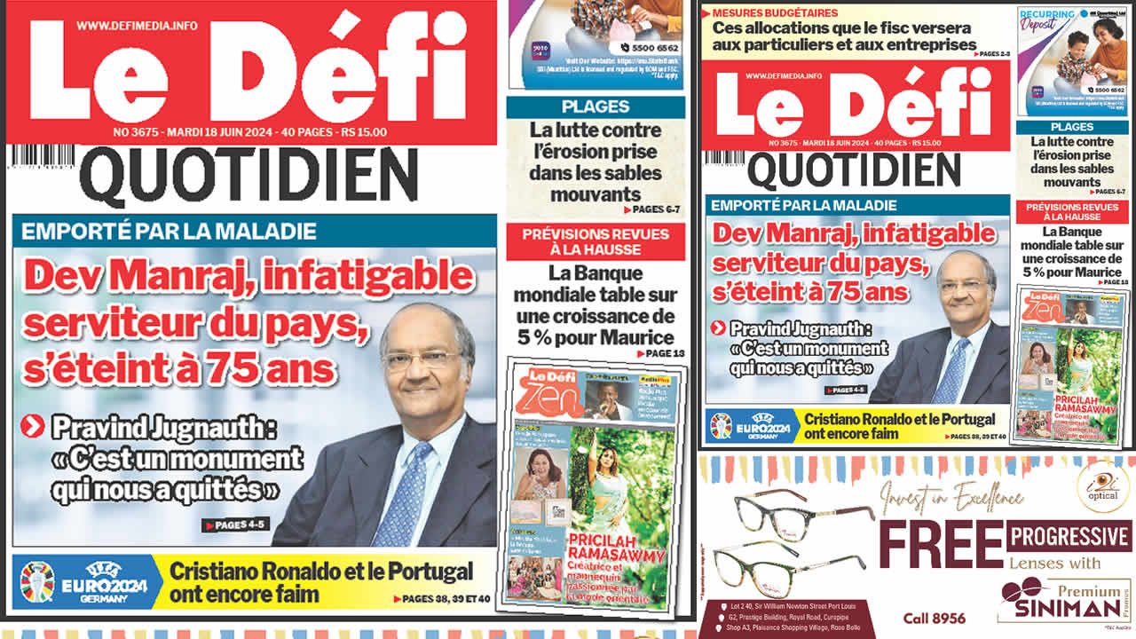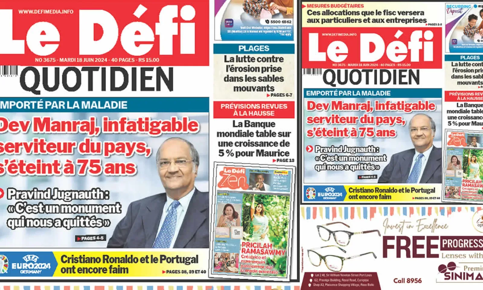 ? Voici la Une du Défi Quotidien. Le journal est en vente à Rs 15 l'exemplaire aux endroits habituels (supermarchés, boutiques, tabagies, superettes). Bonne lecture !