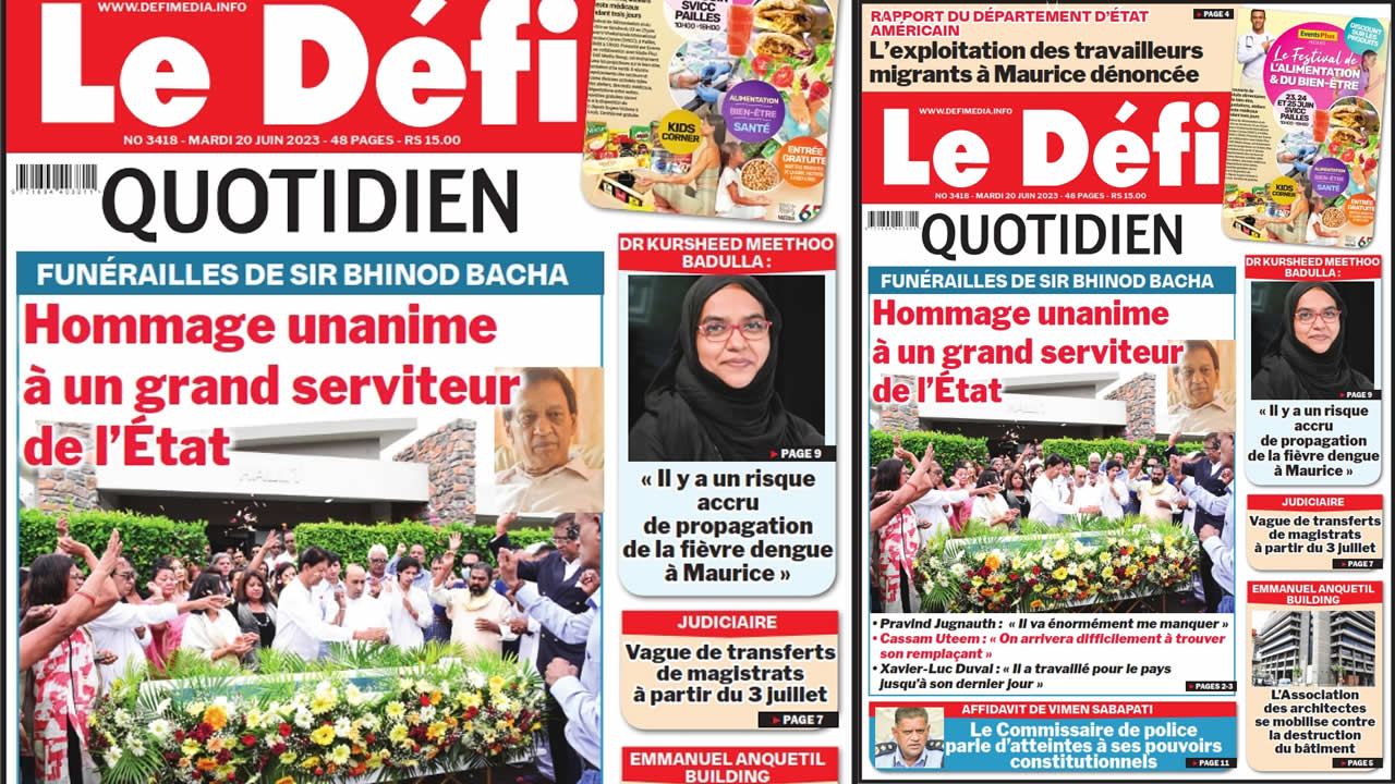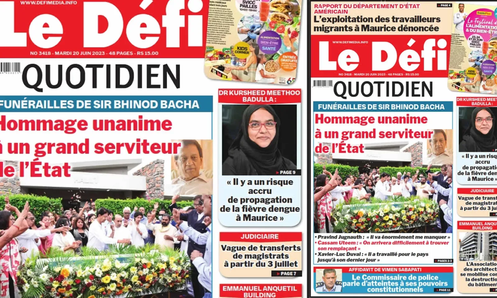 ? Voici la Une du Défi Quotidien. Le journal est en vente à Rs 15 l'exemplaire aux endroits habituels (supermarchés, boutiques, tabagies, superettes). Bonne lecture !