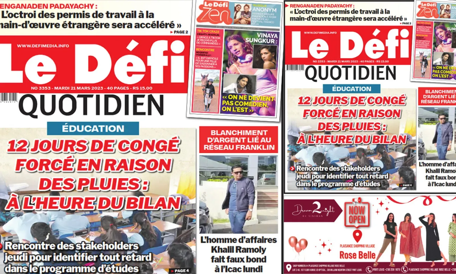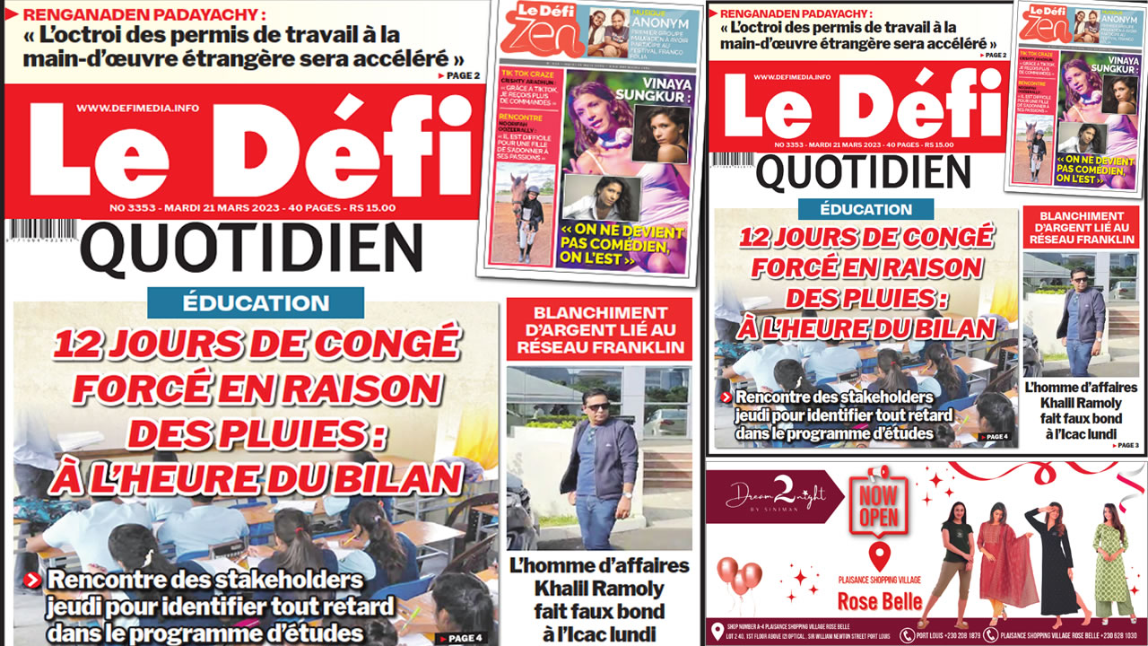 ? Voici la Une du Défi Quotidien. Le journal est en vente à Rs 15 l'exemplaire aux endroits habituels (supermarchés, boutiques, tabagies, superettes). Bonne lecture !
