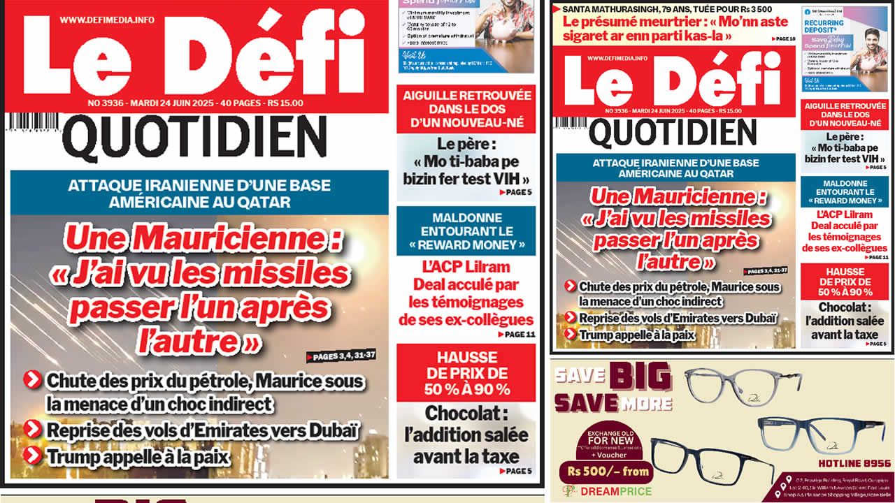 ? Voici la Une du Défi Quotidien. Le journal est en vente à Rs 15 l'exemplaire aux endroits habituels (supermarchés, boutiques, tabagies, superettes). Bonne lecture !