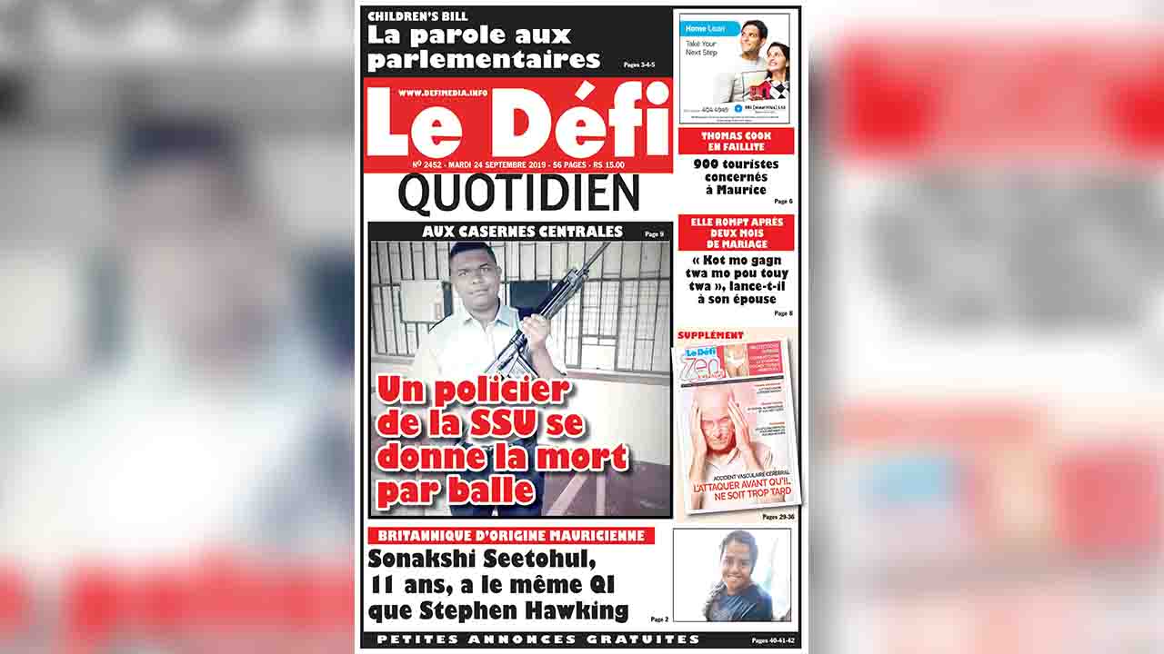 Voici la Une du Defi Quotidien de ce mardi 24 septembre 2019