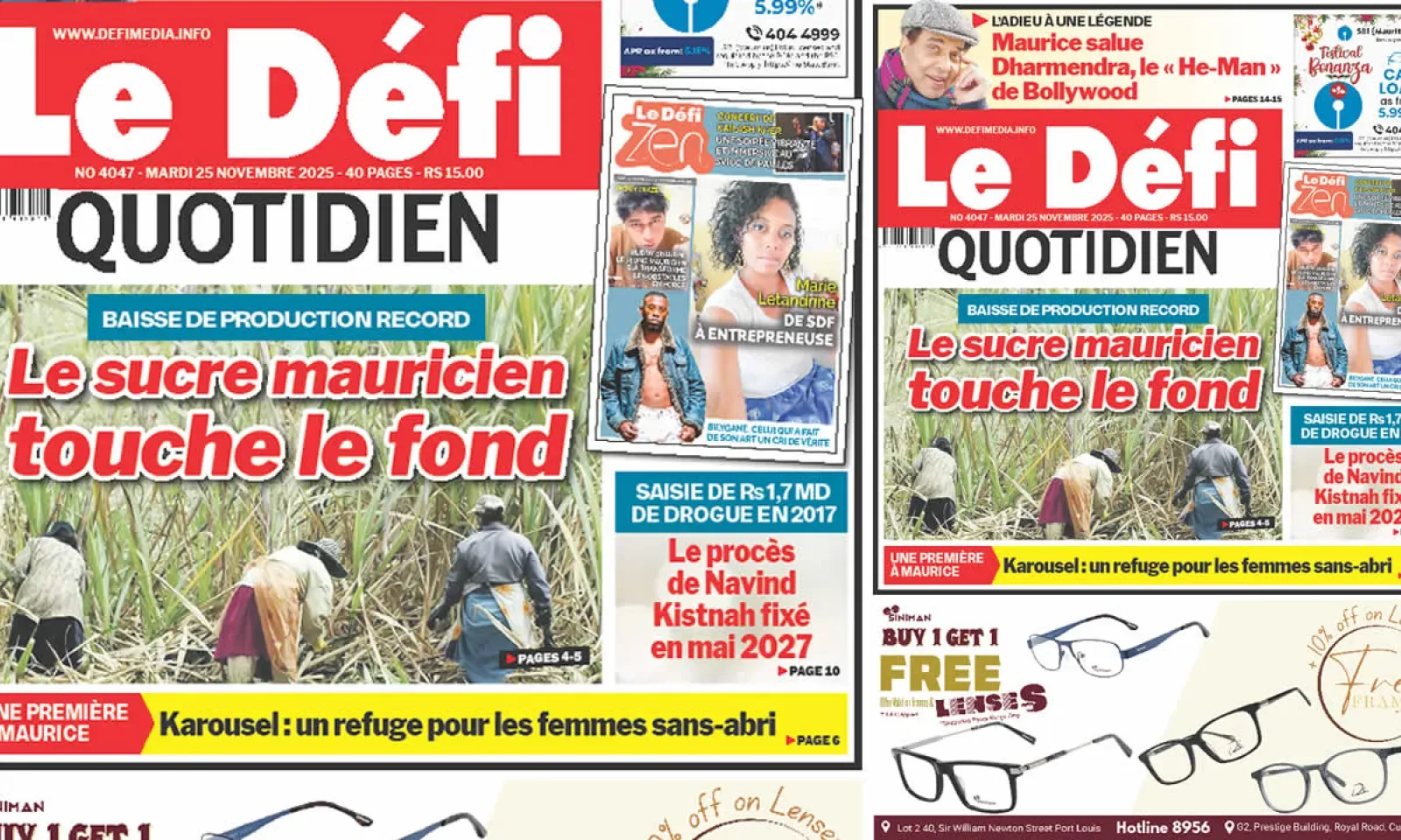 Voici la Une du Défi Quotidien. Le journal est en vente à Rs 15 l'exemplaire aux endroits habituels (supermarchés, boutiques, tabagies, superettes). Bonne lecture !