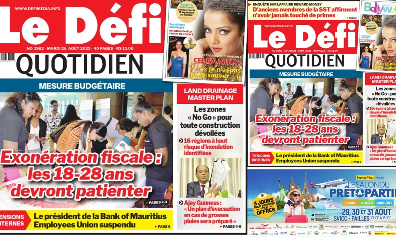 ? Voici la Une du Défi Quotidien. Le journal est en vente à Rs 15 l'exemplaire aux endroits habituels (supermarchés, boutiques, tabagies, superettes). Bonne lecture !