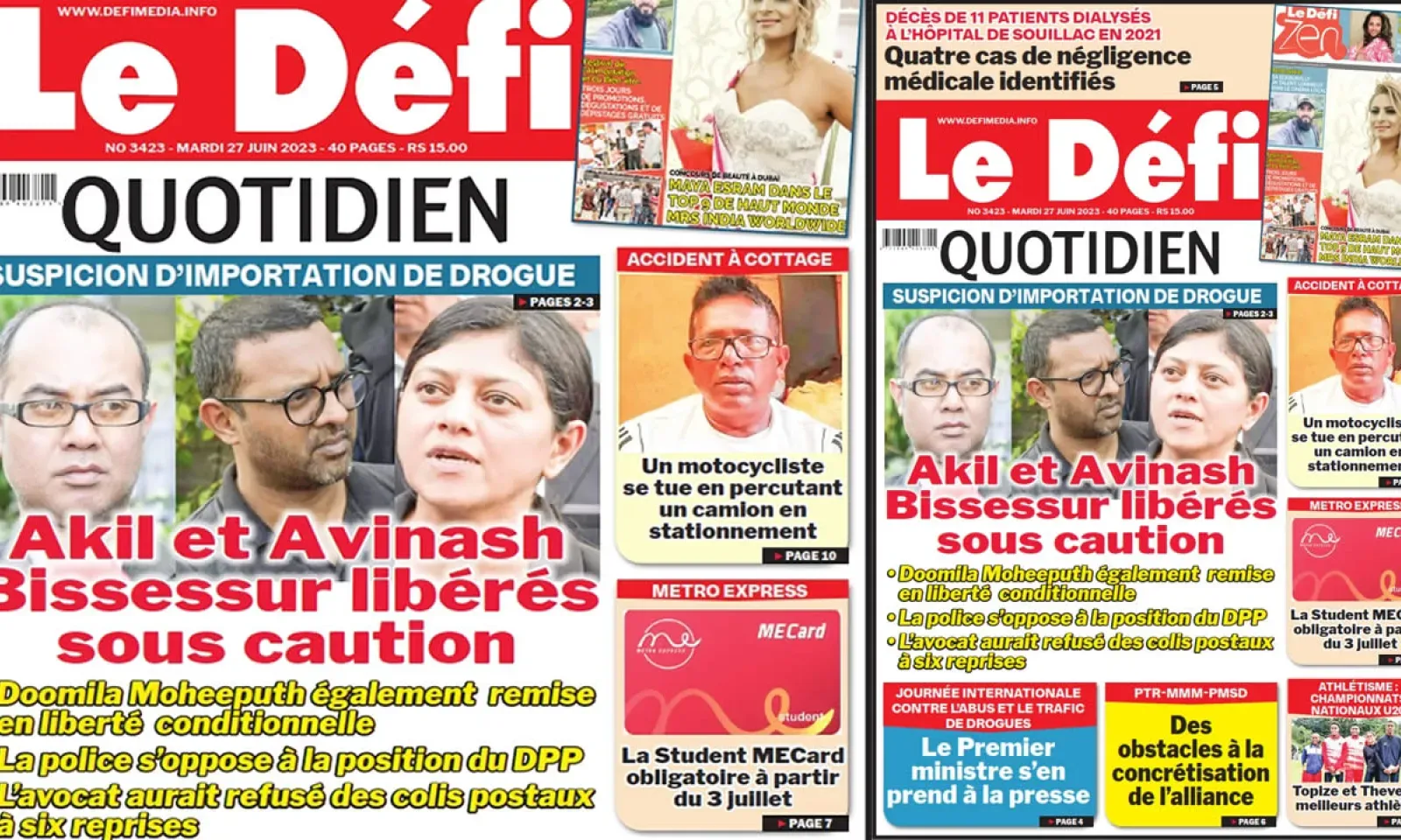 ? Voici la Une du Défi Quotidien. Le journal est en vente à Rs 15 l'exemplaire aux endroits habituels (supermarchés, boutiques, tabagies, superettes). Bonne lecture !