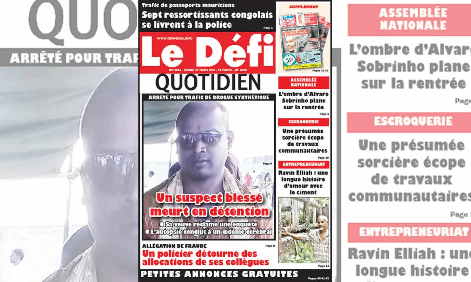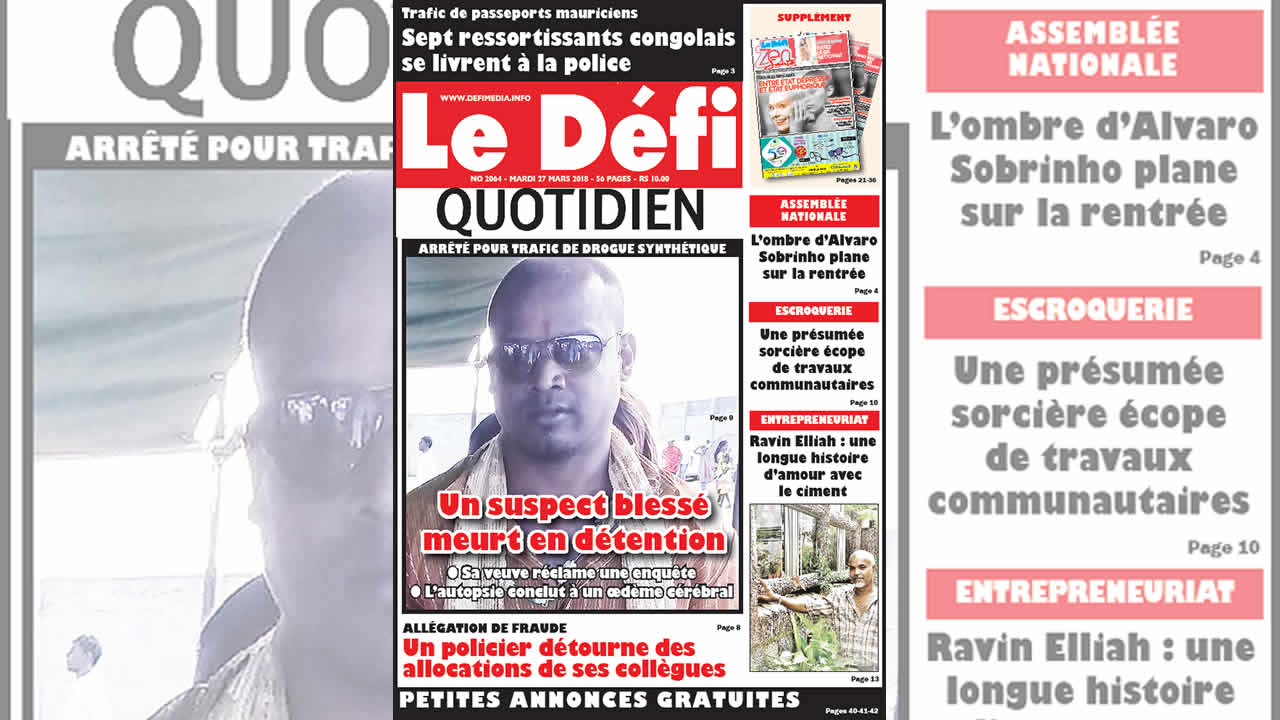 Eddyssen Pachee, 39 ans, est mort aux petites heures de lundi 26 mars à l’hôpital SSRN, Pamplemousses. Un policier était posté en sentinelle à son chevet. Il a été arrêté samedi pour ‘drug dealing’. En voyant les limiers, il aurait avalé une certaine quantité de drogue synthétique. Sa famille, elle, allègue qu’il a été victime de brutalité policière.