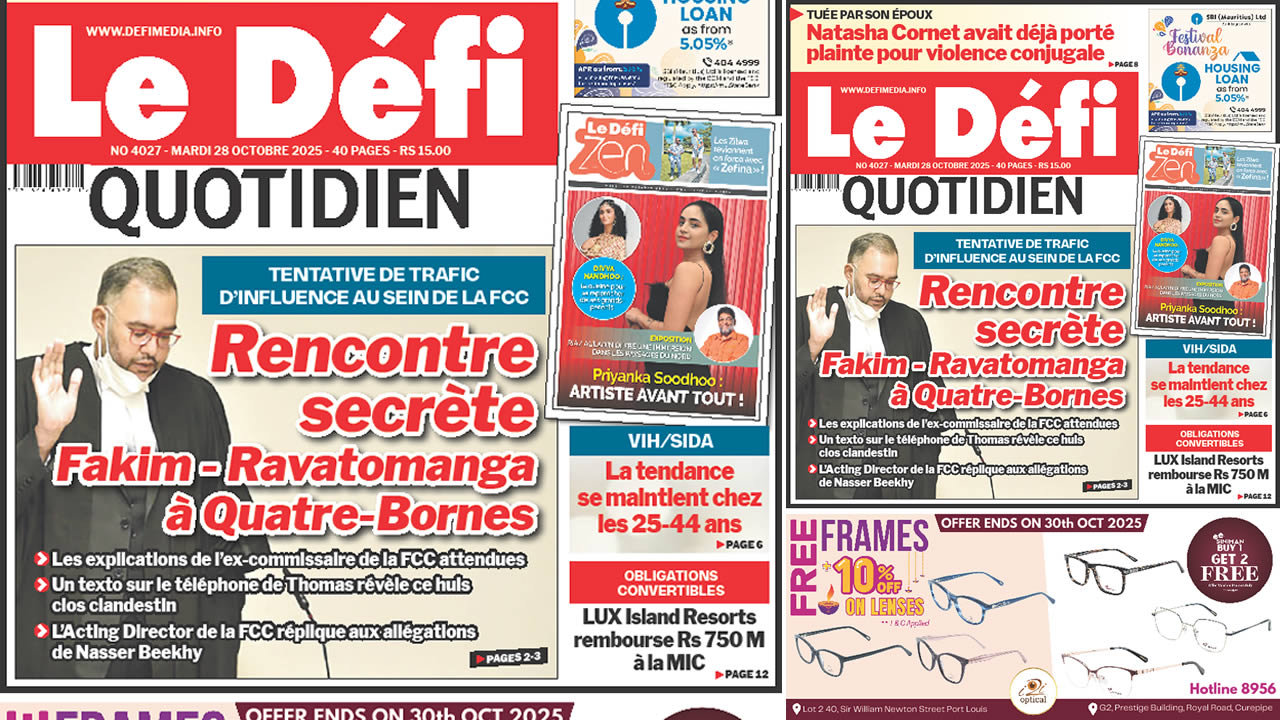 ? Voici la Une du Défi Quotidien. Le journal est en vente à Rs 15 l'exemplaire aux endroits habituels (supermarchés, boutiques, tabagies, superettes). Bonne lecture !