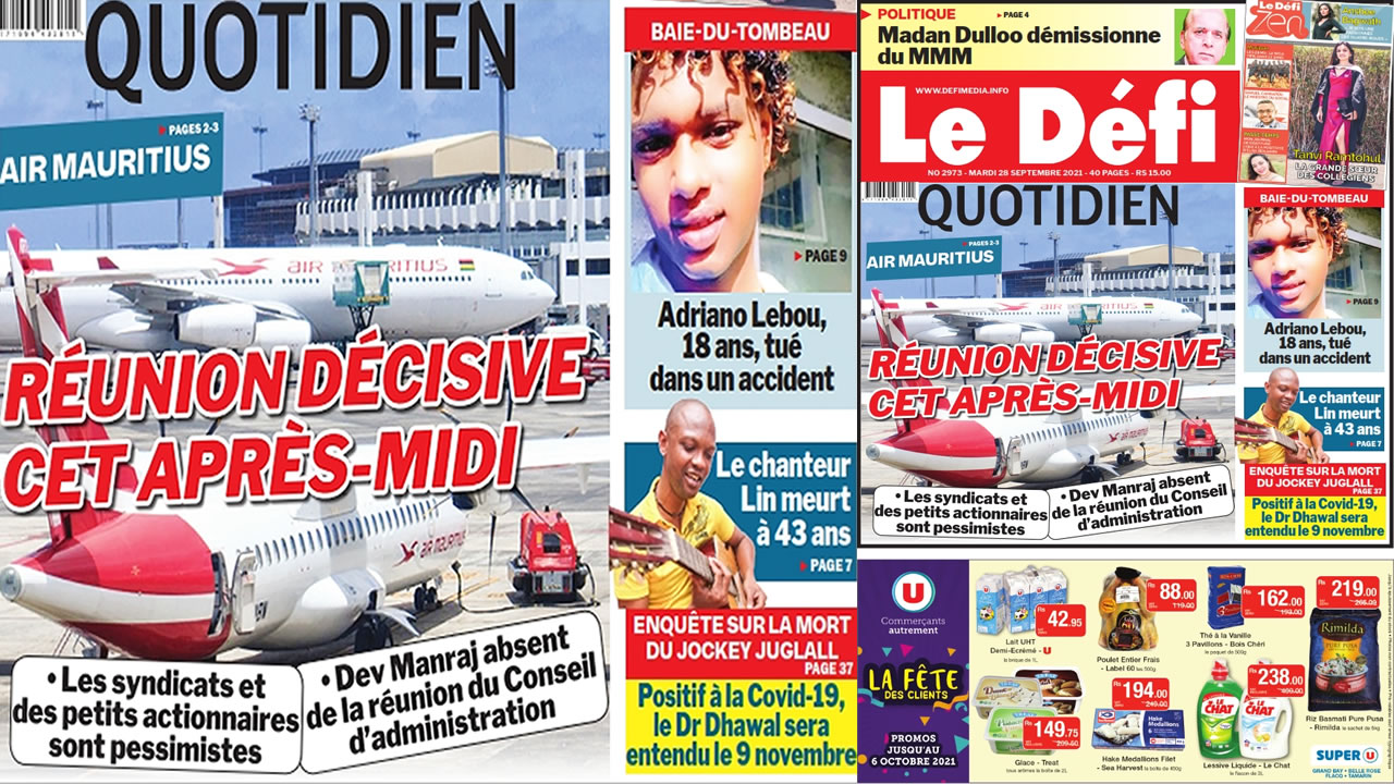 ? Voici la Une du Défi Quotidien. Le journal est en vente à Rs 15 l'exemplaire aux endroits habituels (supermarchés, boutiques, tabagies, superettes). Bonne lecture !