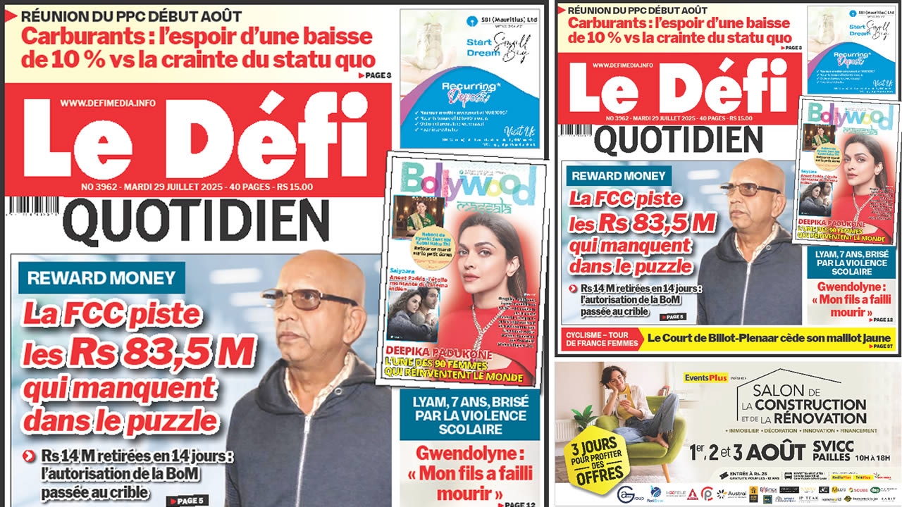 ? Voici la Une du Défi Quotidien. Le journal est en vente à Rs 15 l'exemplaire aux endroits habituels (supermarchés, boutiques, tabagies, superettes). Bonne lecture !
