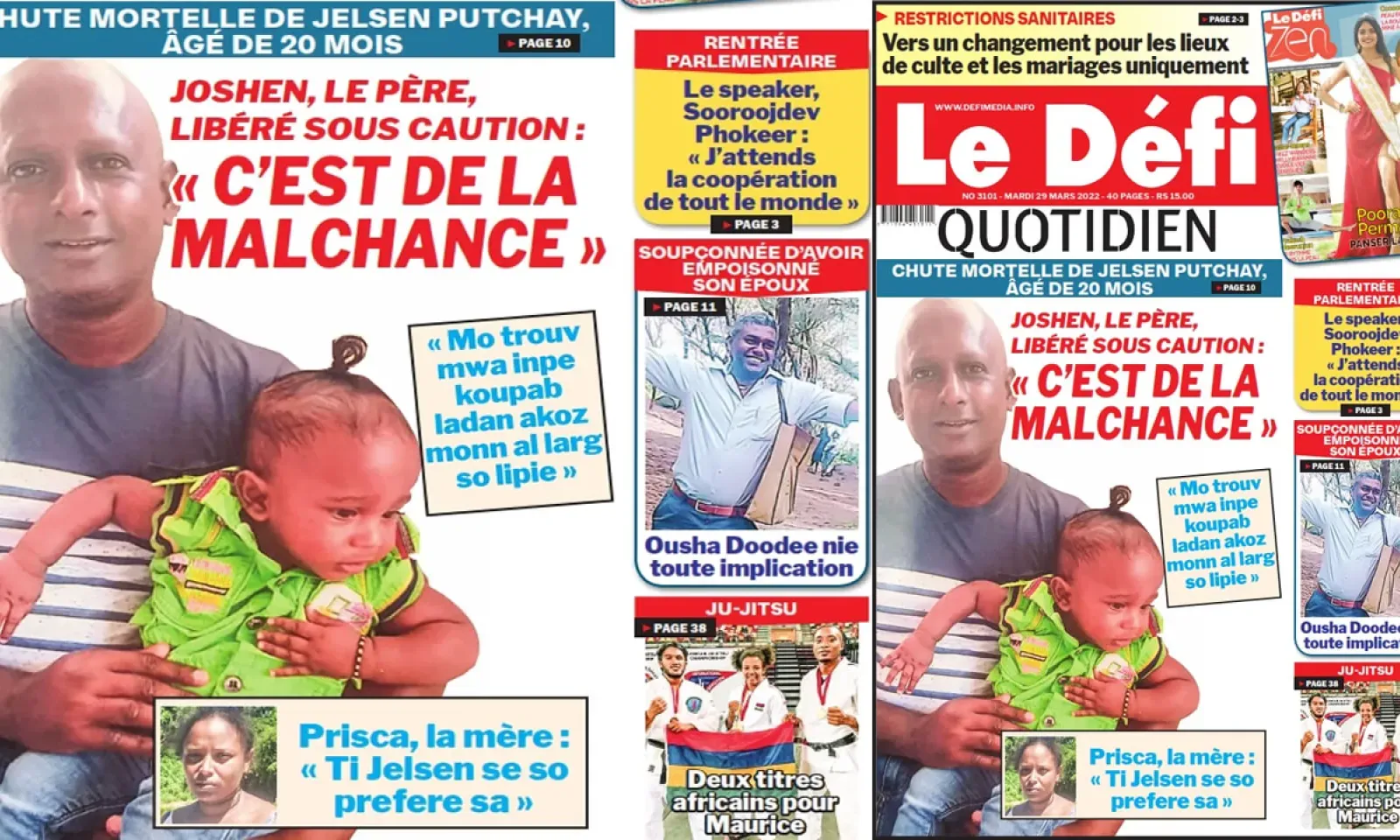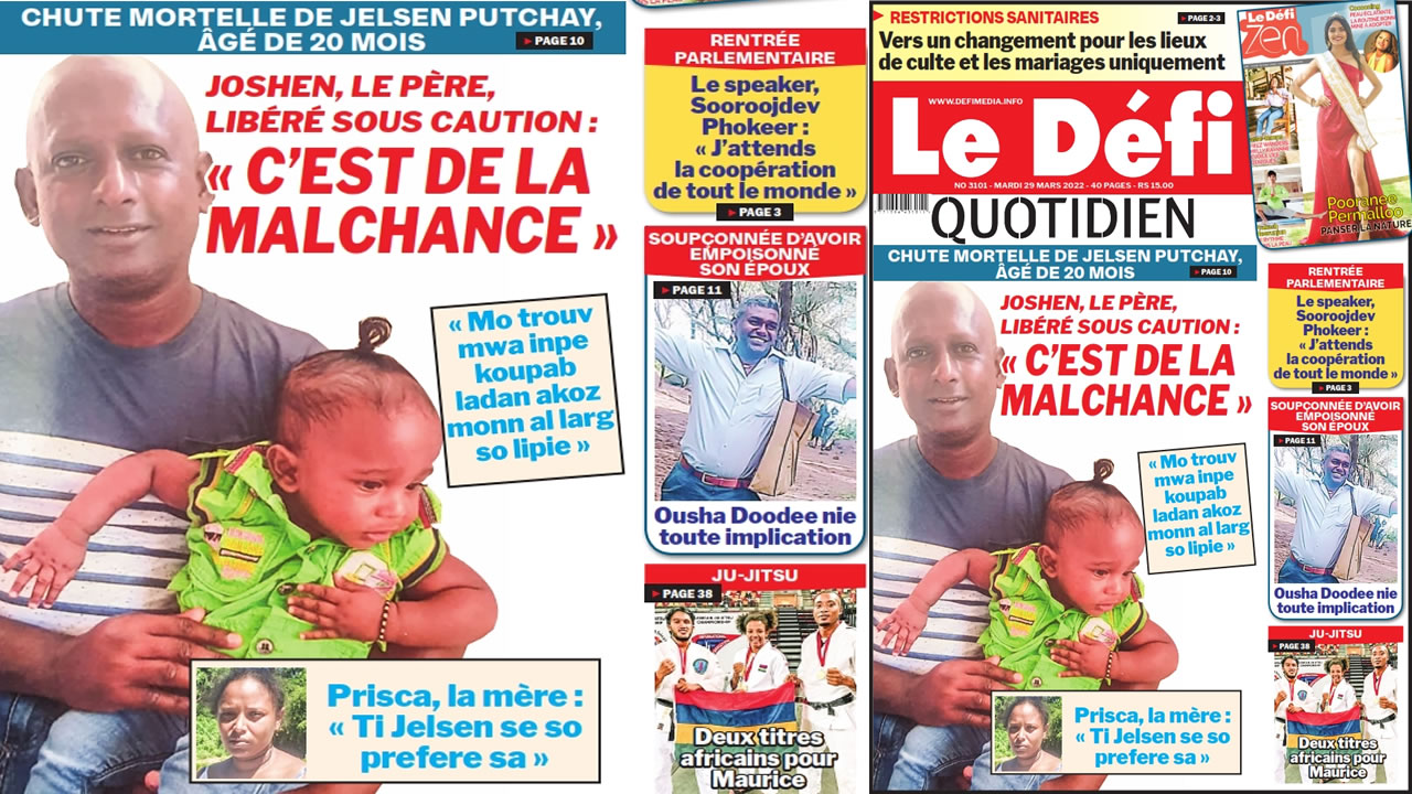 Joshen Putchay, 42 ans, le père du petit Jelsen, âgé de 20 mois, a été libéré sous caution devant la cour de Savanne aux petites heures du lundi 28 mars. Accusé provisoirement pour homicide involontaire après le décès de son fils, le père évoque avec regret : « Mo ti extra kontan mo garson ».