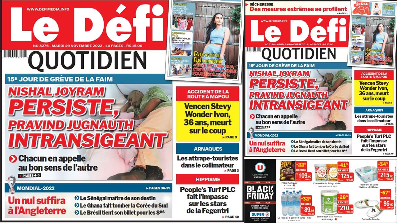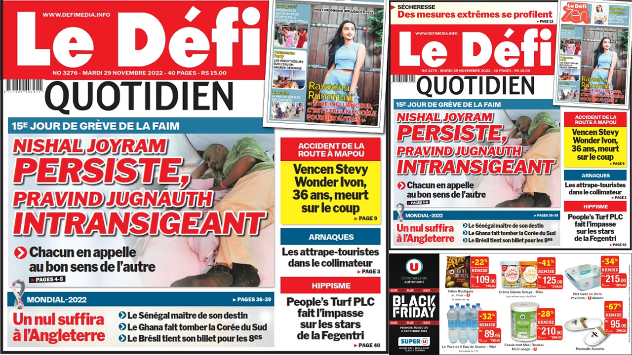 Voici la une du Défi Quotidien de ce mardi 29 Novembre 2022