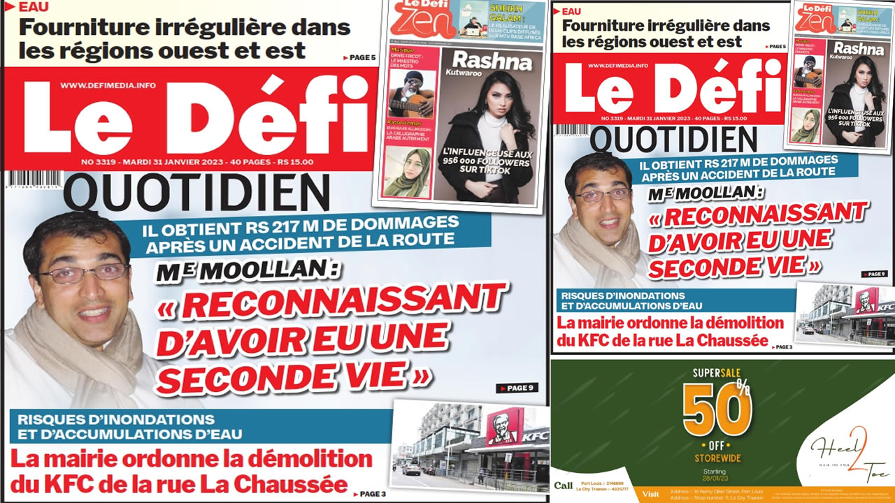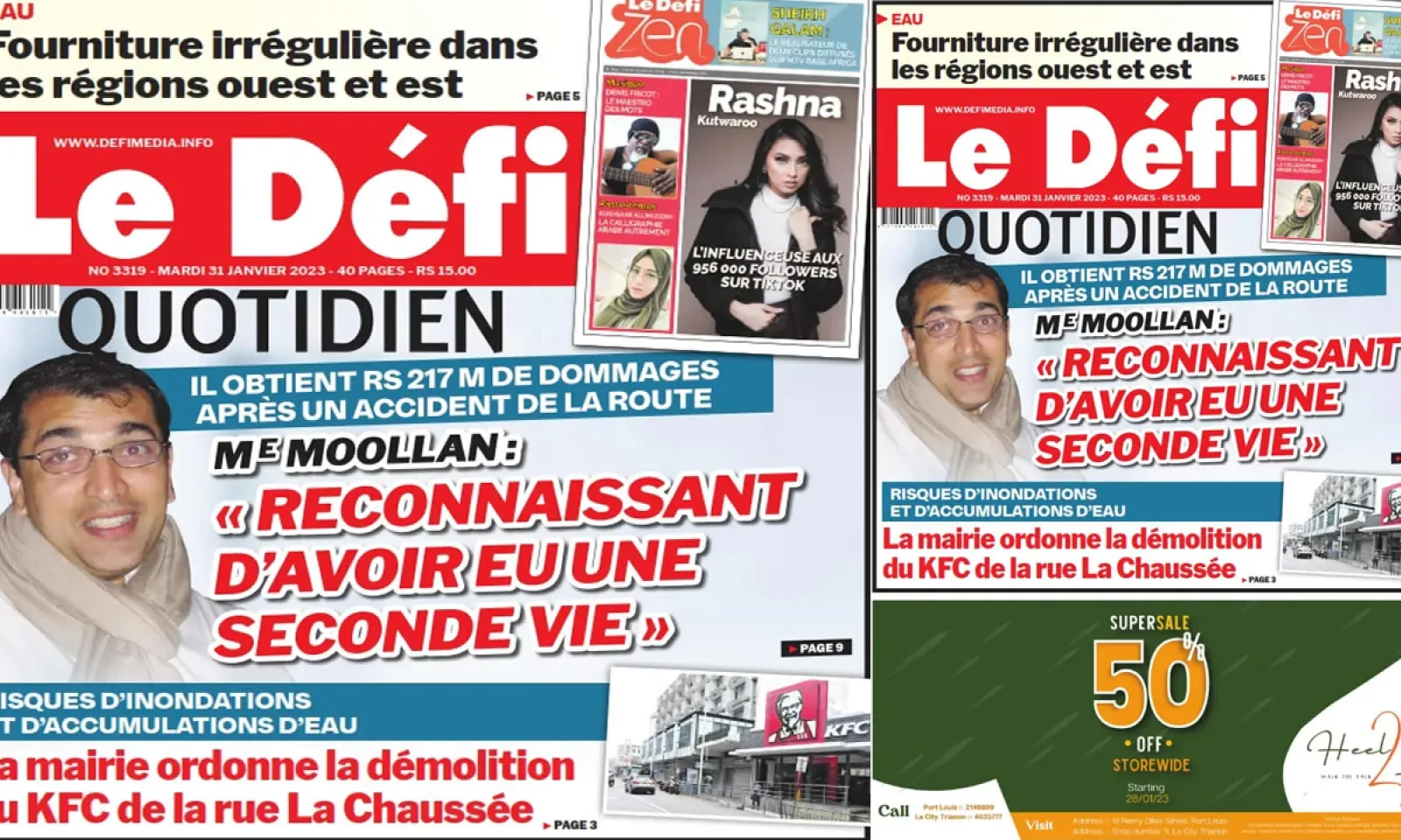 ? Voici la Une du Défi Quotidien. Le journal est en vente à Rs 15 l'exemplaire aux endroits habituels (supermarchés, boutiques, tabagies, superettes). Bonne lecture !