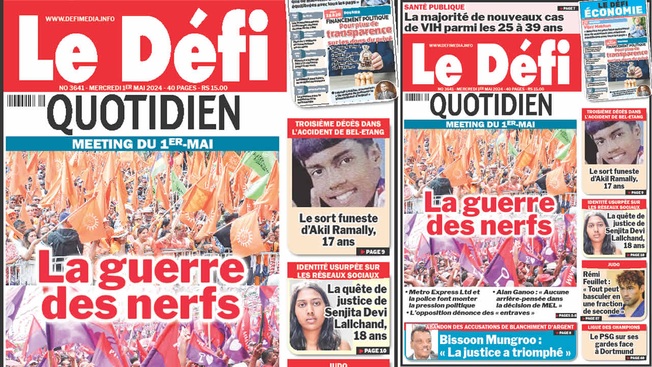 ? Voici la Une du Défi Quotidien. Le journal est en vente à Rs 15 l'exemplaire aux endroits habituels (supermarchés, boutiques, tabagies, superettes). Bonne lecture !