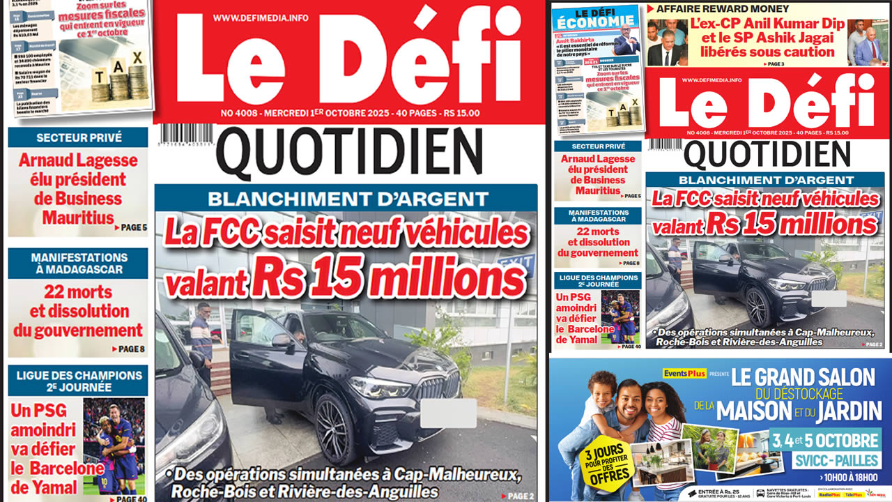 ? Voici la Une du Défi Quotidien. Le journal est en vente à Rs 15 l'exemplaire aux endroits habituels (supermarchés, boutiques, tabagies, superettes). Bonne lecture !