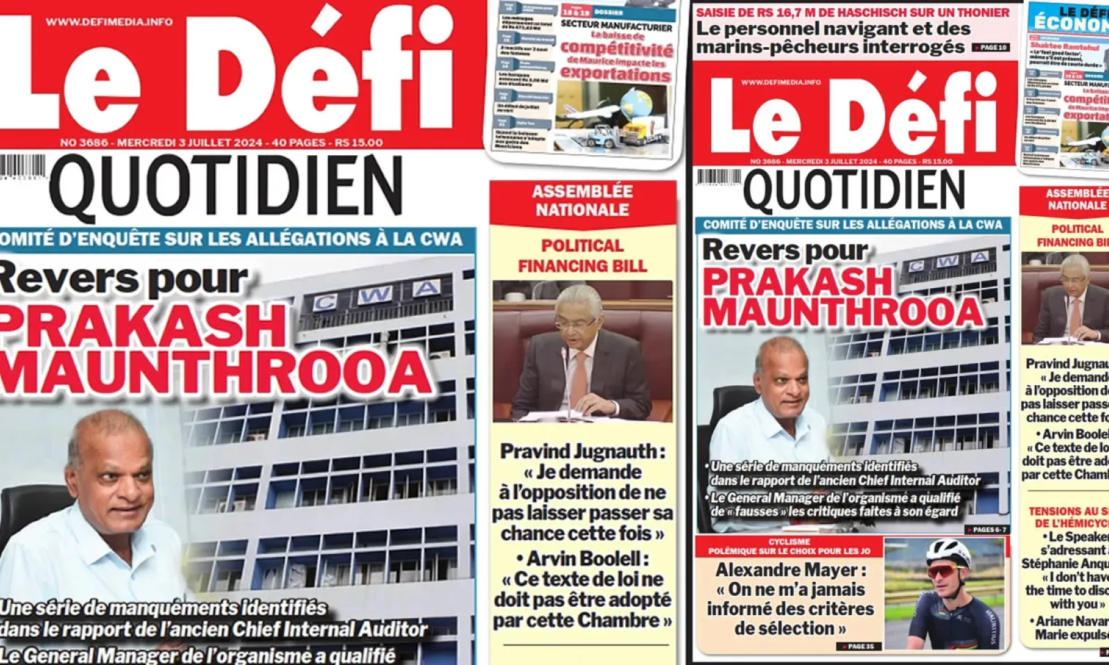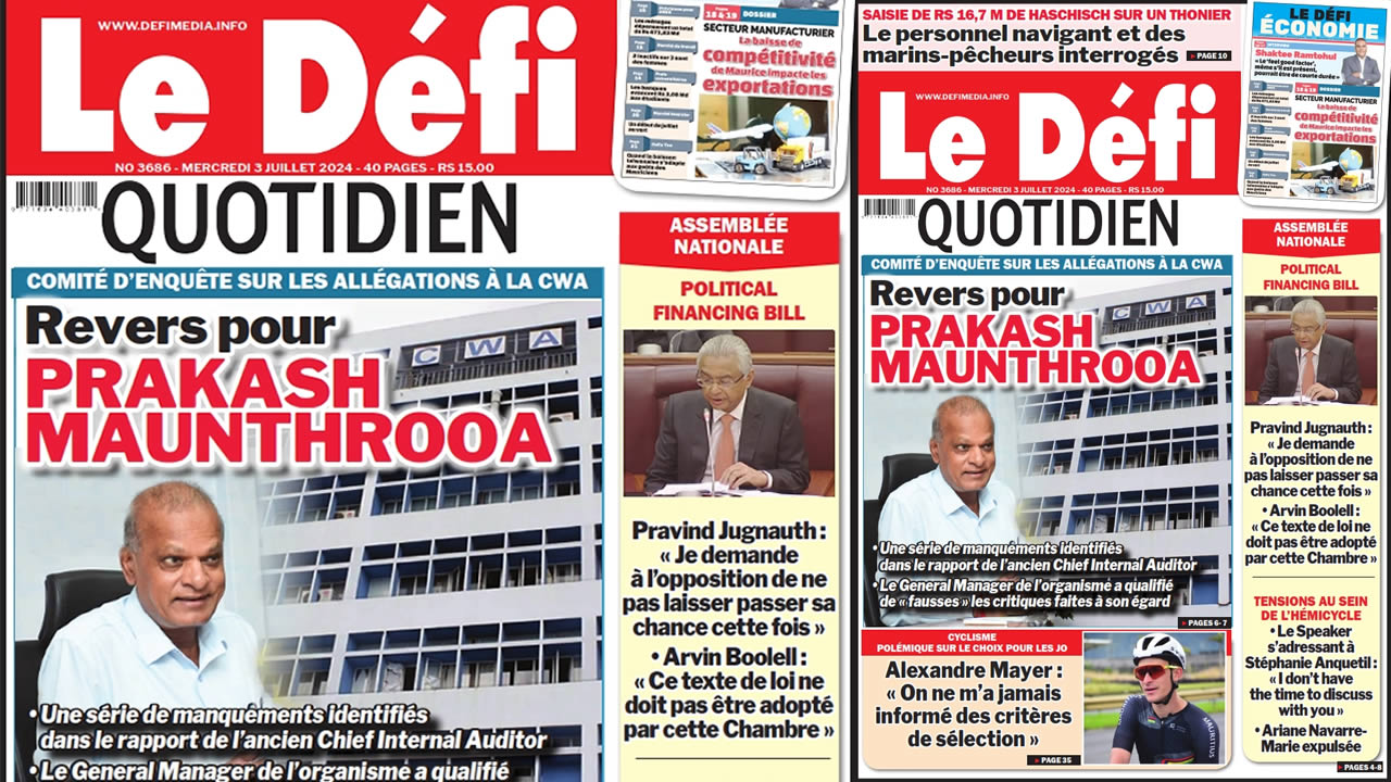 ? Voici la Une du Défi Quotidien. Le journal est en vente à Rs 15 l'exemplaire aux endroits habituels (supermarchés, boutiques, tabagies, superettes). Bonne lecture !