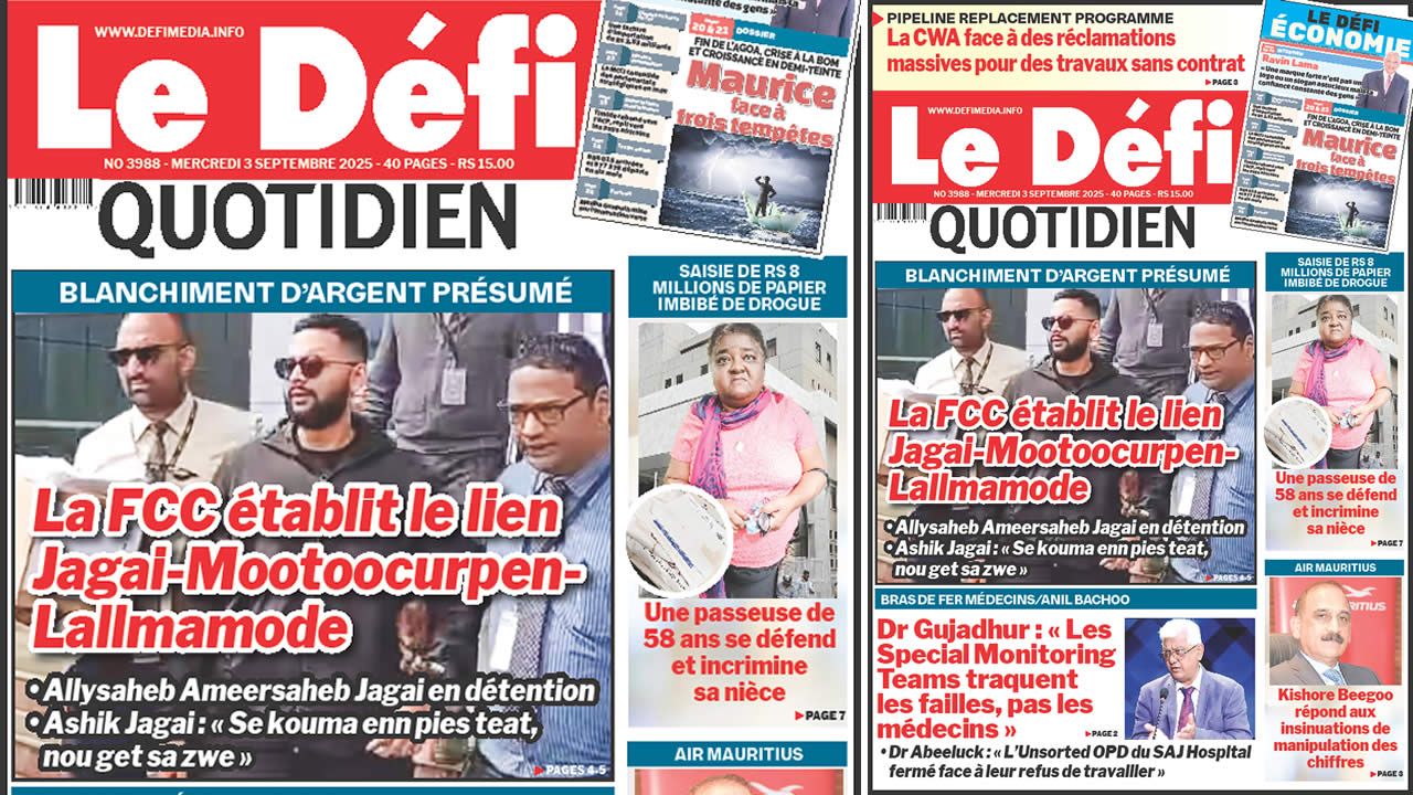 ? Voici la Une du Défi Quotidien. Le journal est en vente à Rs 15 l'exemplaire aux endroits habituels (supermarchés, boutiques, tabagies, superettes). Bonne lecture !