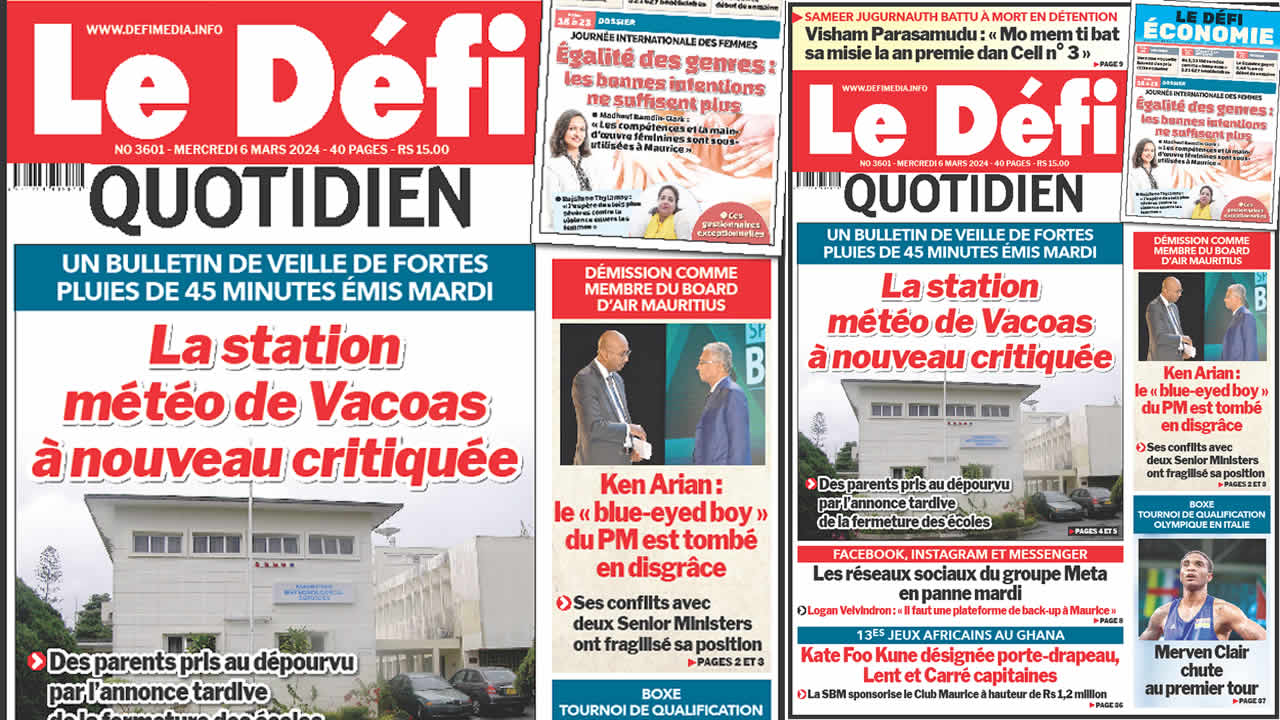 ? Voici la Une du Défi Quotidien. Le journal est en vente à Rs 15 l'exemplaire aux endroits habituels (supermarchés, boutiques, tabagies, superettes). Bonne lecture !
