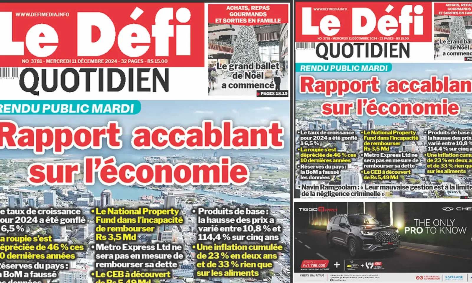 ? Voici la Une du Défi Quotidien. Le journal est en vente à Rs 15 l'exemplaire aux endroits habituels (supermarchés, boutiques, tabagies, superettes). Bonne lecture !