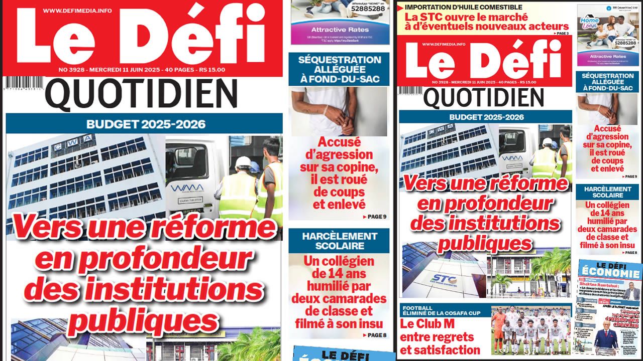 ? Voici la Une du Défi Quotidien. Le journal est en vente à Rs 15 l'exemplaire aux endroits habituels (supermarchés, boutiques, tabagies, superettes). Bonne lecture !