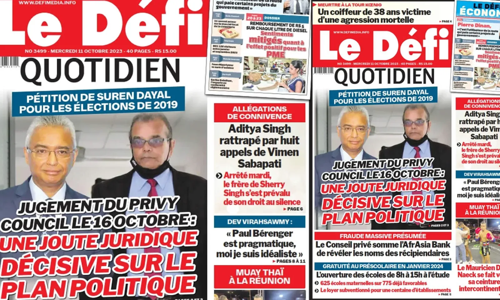 ? Voici la Une du Défi Quotidien. Le journal est en vente à Rs 15 l'exemplaire aux endroits habituels (supermarchés, boutiques, tabagies, superettes). Bonne lecture !