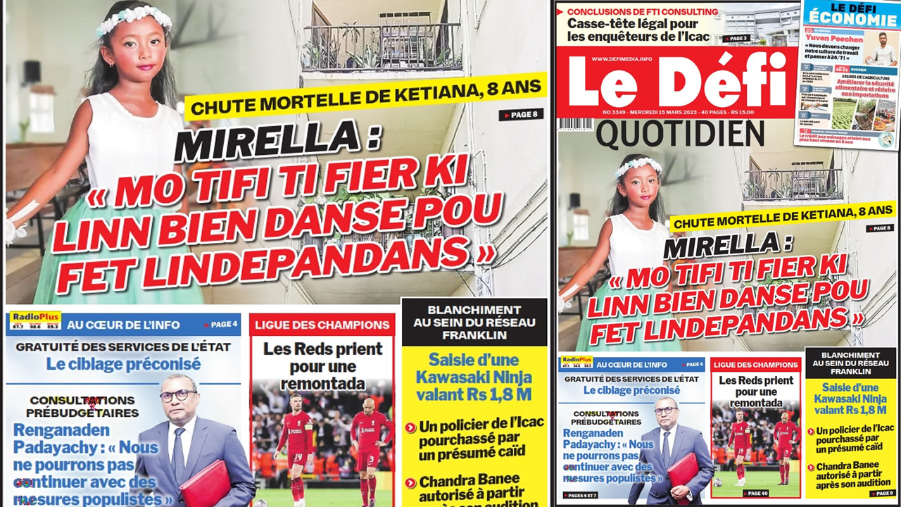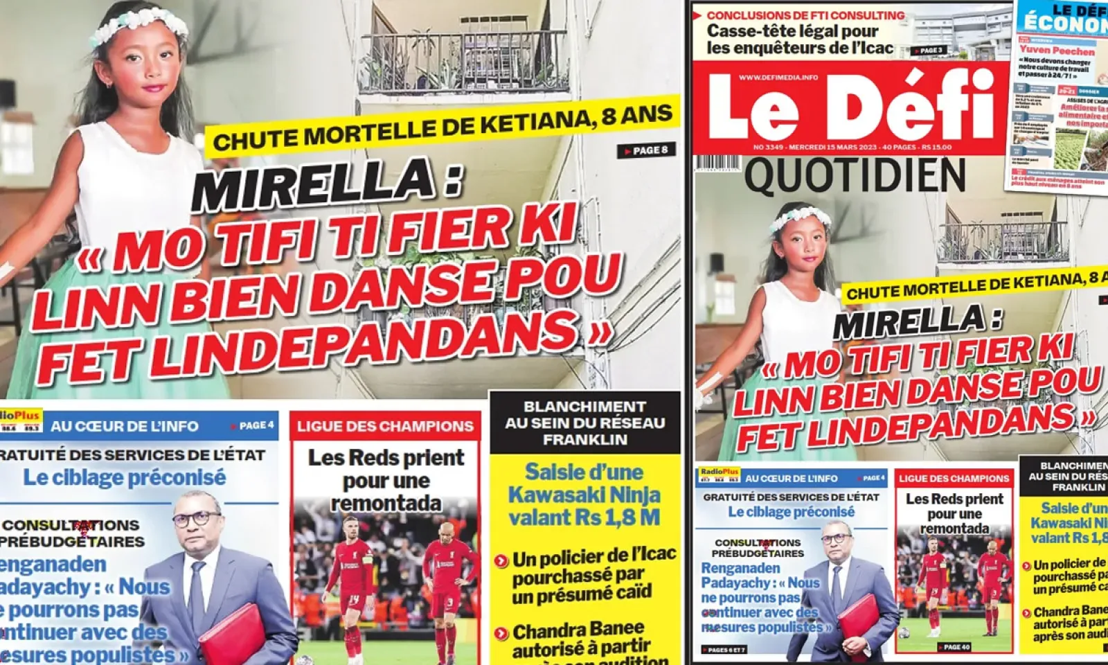 ? Voici la Une du Défi Quotidien. Le journal est en vente à Rs 15 l'exemplaire aux endroits habituels (supermarchés, boutiques, tabagies, superettes). Bonne lecture !