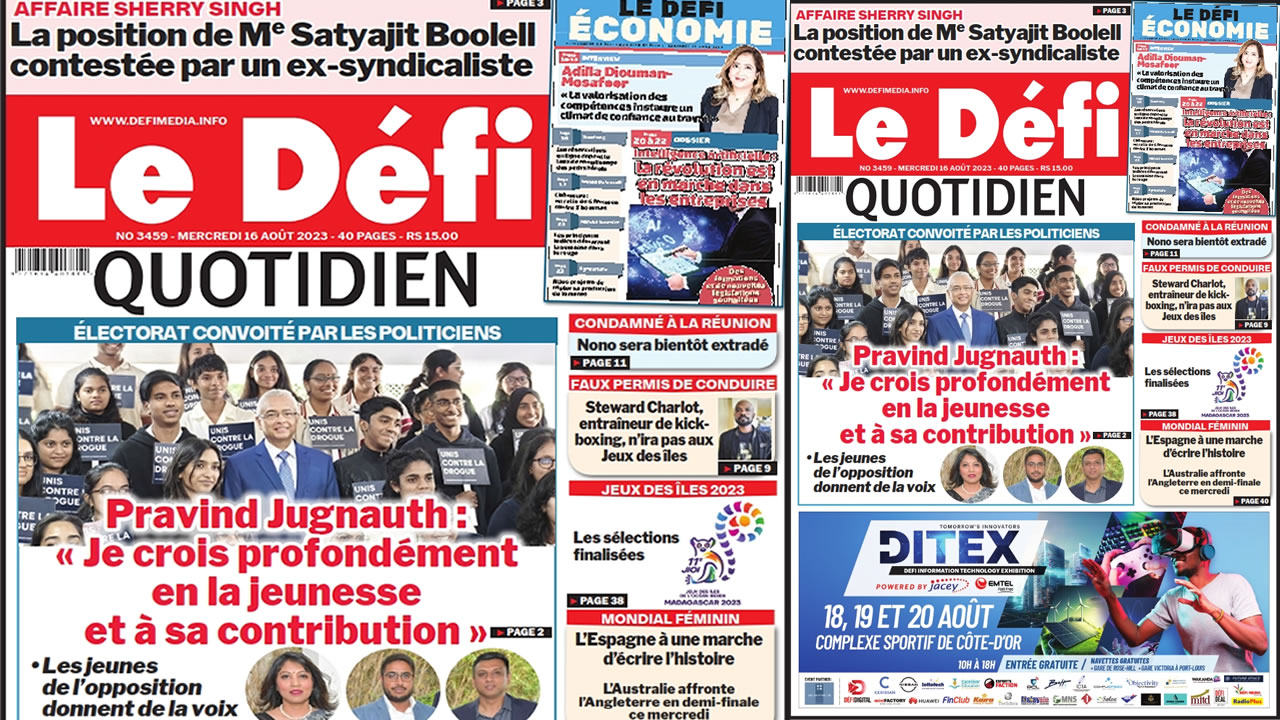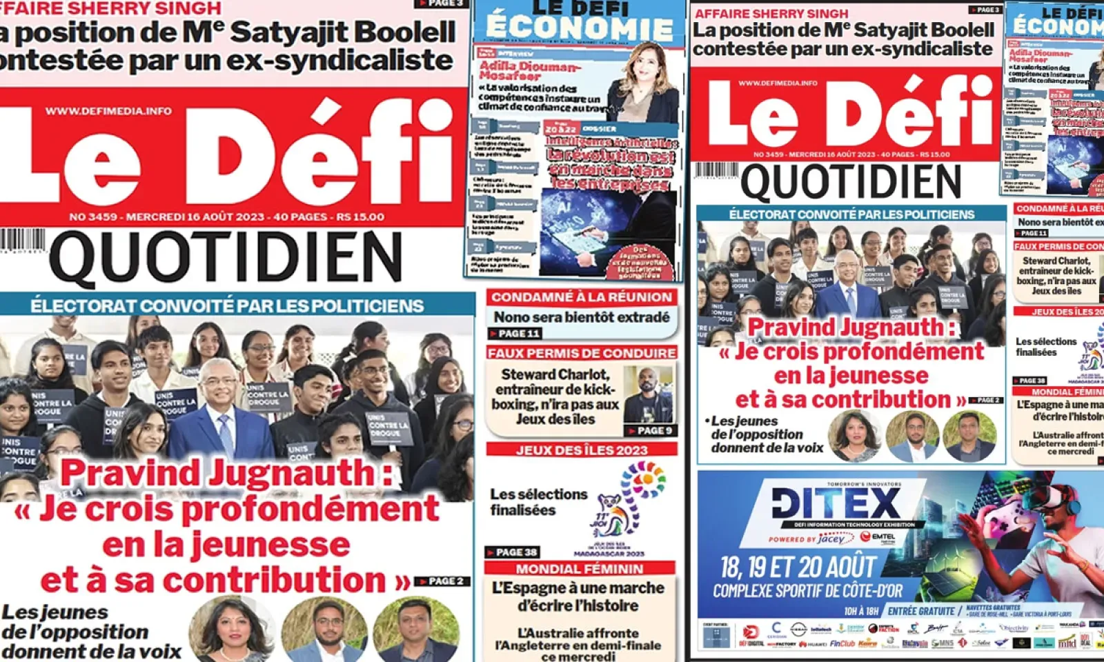 ? Voici la Une du Défi Quotidien. Le journal est en vente à Rs 15 l'exemplaire aux endroits habituels (supermarchés, boutiques, tabagies, superettes). Bonne lecture !