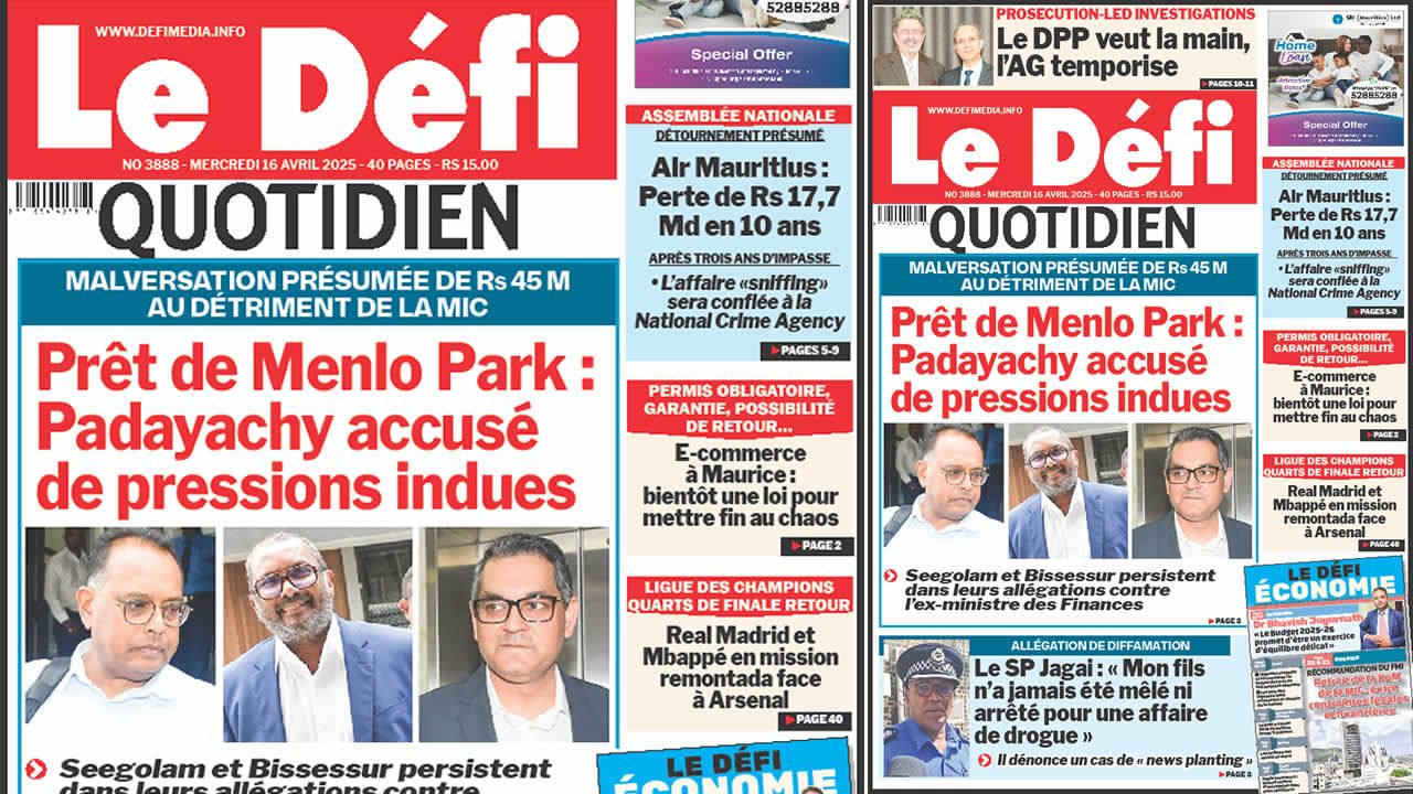 ? Voici la Une du Défi Quotidien. Le journal est en vente à Rs 15 l'exemplaire aux endroits habituels (supermarchés, boutiques, tabagies, superettes). Bonne lecture !