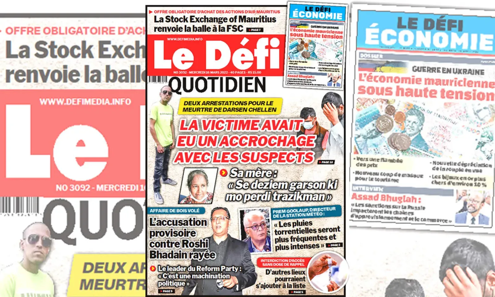 ? Voici la Une du Défi Quotidien. Le journal est en vente à Rs 15 l'exemplaire aux endroits habituels (supermarchés, boutiques, tabagies, superettes). Bonne lecture !
