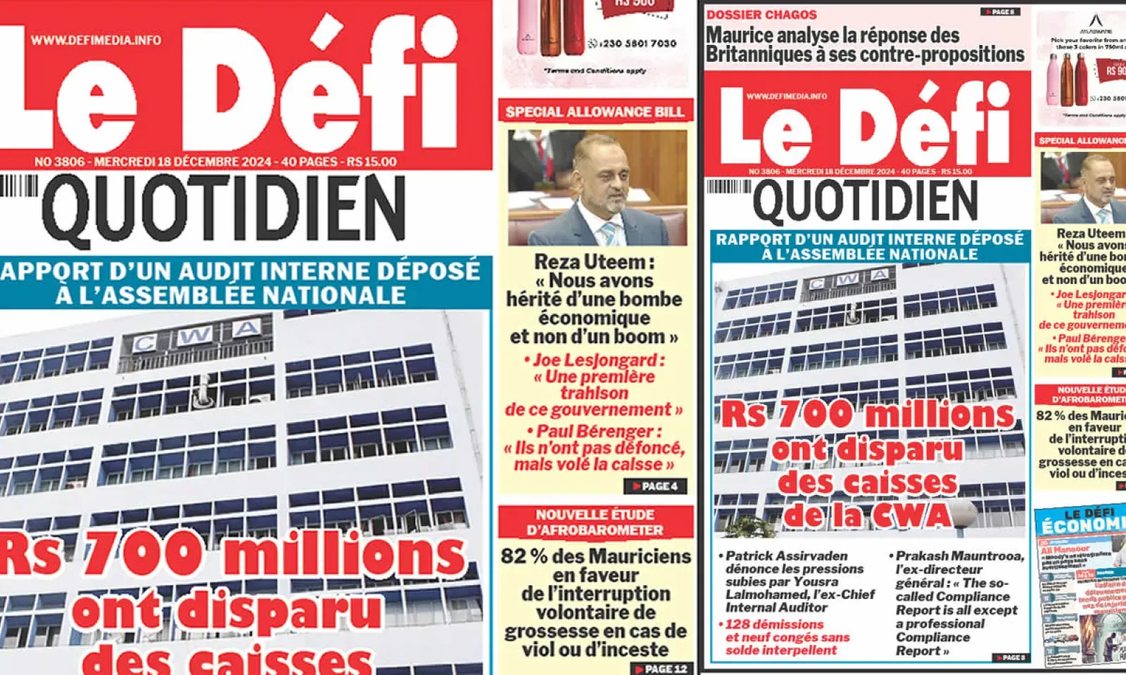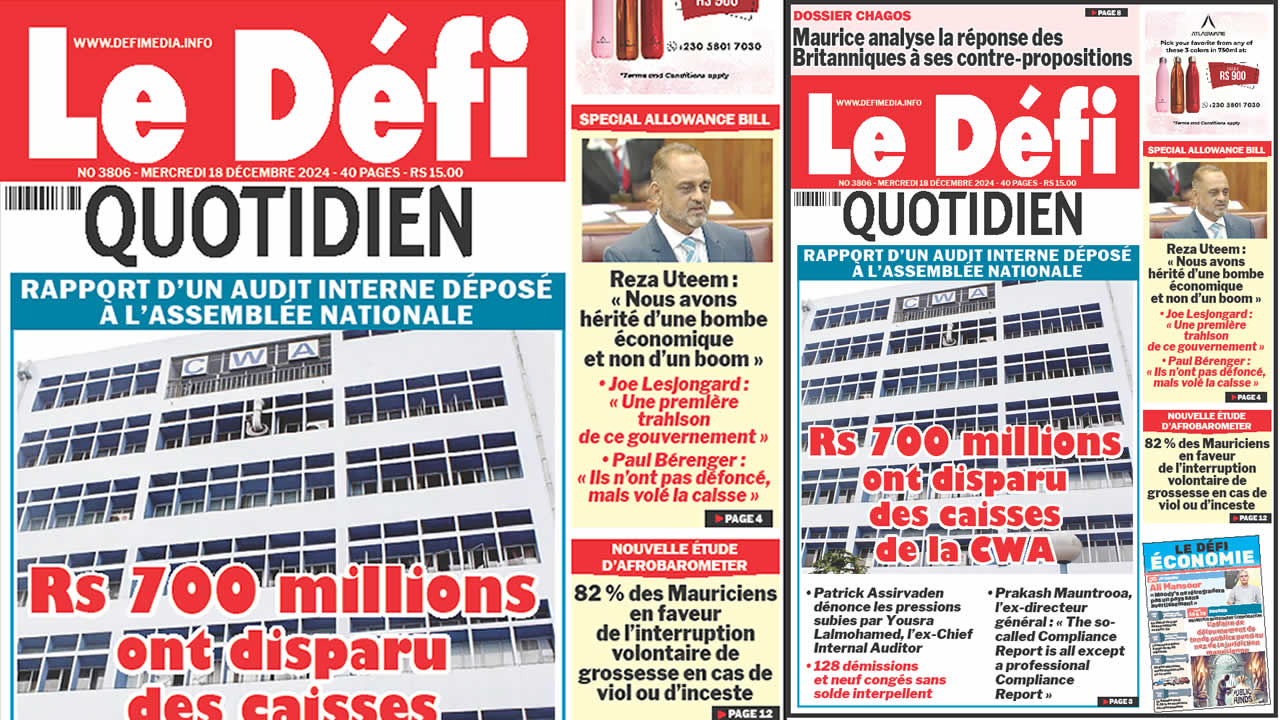 ? Voici la Une du Défi Quotidien. Le journal est en vente à Rs 15 l'exemplaire aux endroits habituels (supermarchés, boutiques, tabagies, superettes). Bonne lecture !