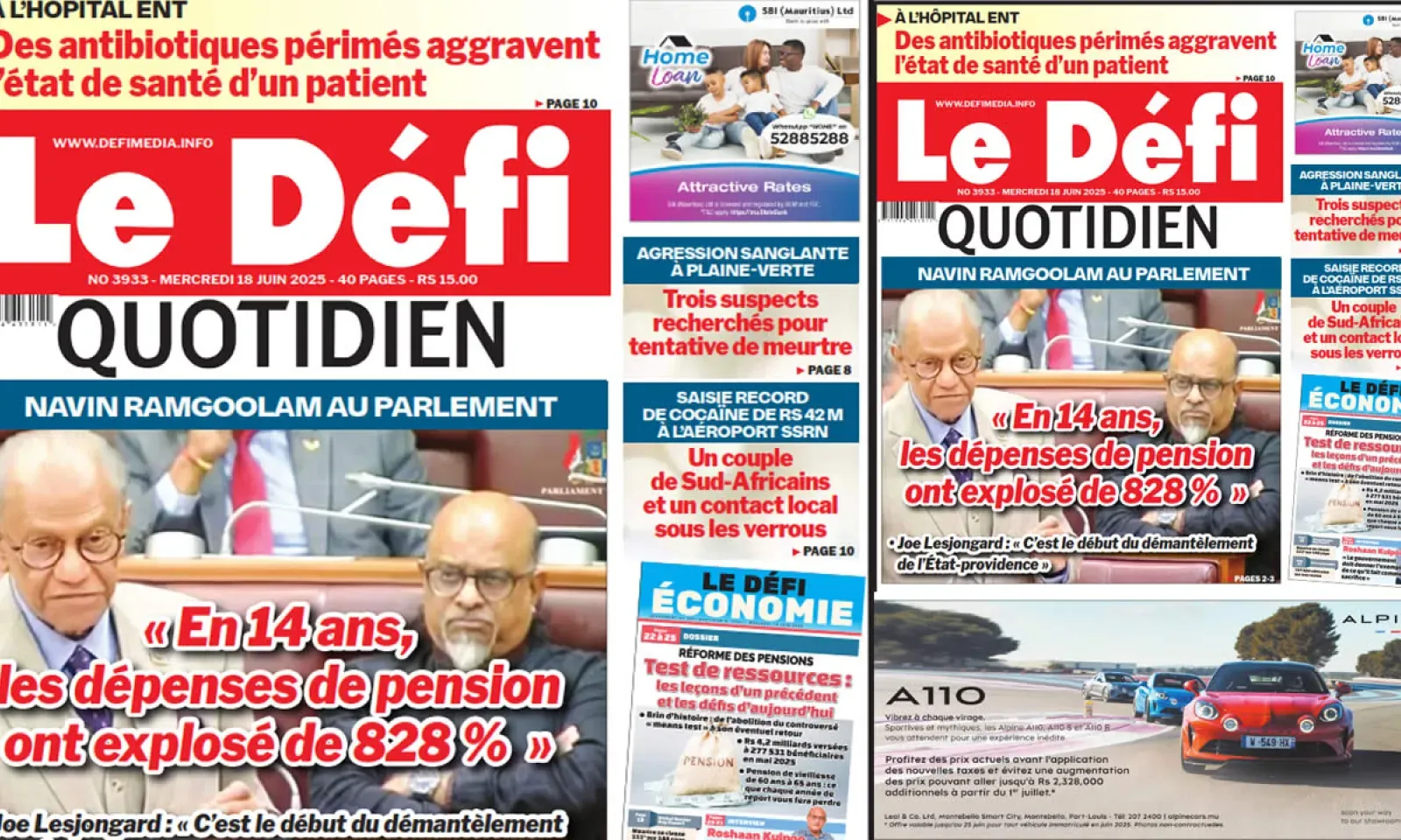 ? Voici la Une du Défi Quotidien. Le journal est en vente à Rs 15 l'exemplaire aux endroits habituels (supermarchés, boutiques, tabagies, superettes). Bonne lecture !