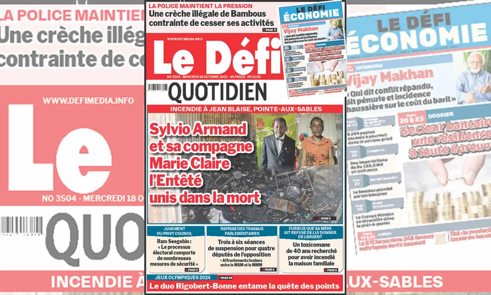 ? Voici la Une du Défi Quotidien. Le journal est en vente à Rs 15 l'exemplaire aux endroits habituels (supermarchés, boutiques, tabagies, superettes). Bonne lecture !