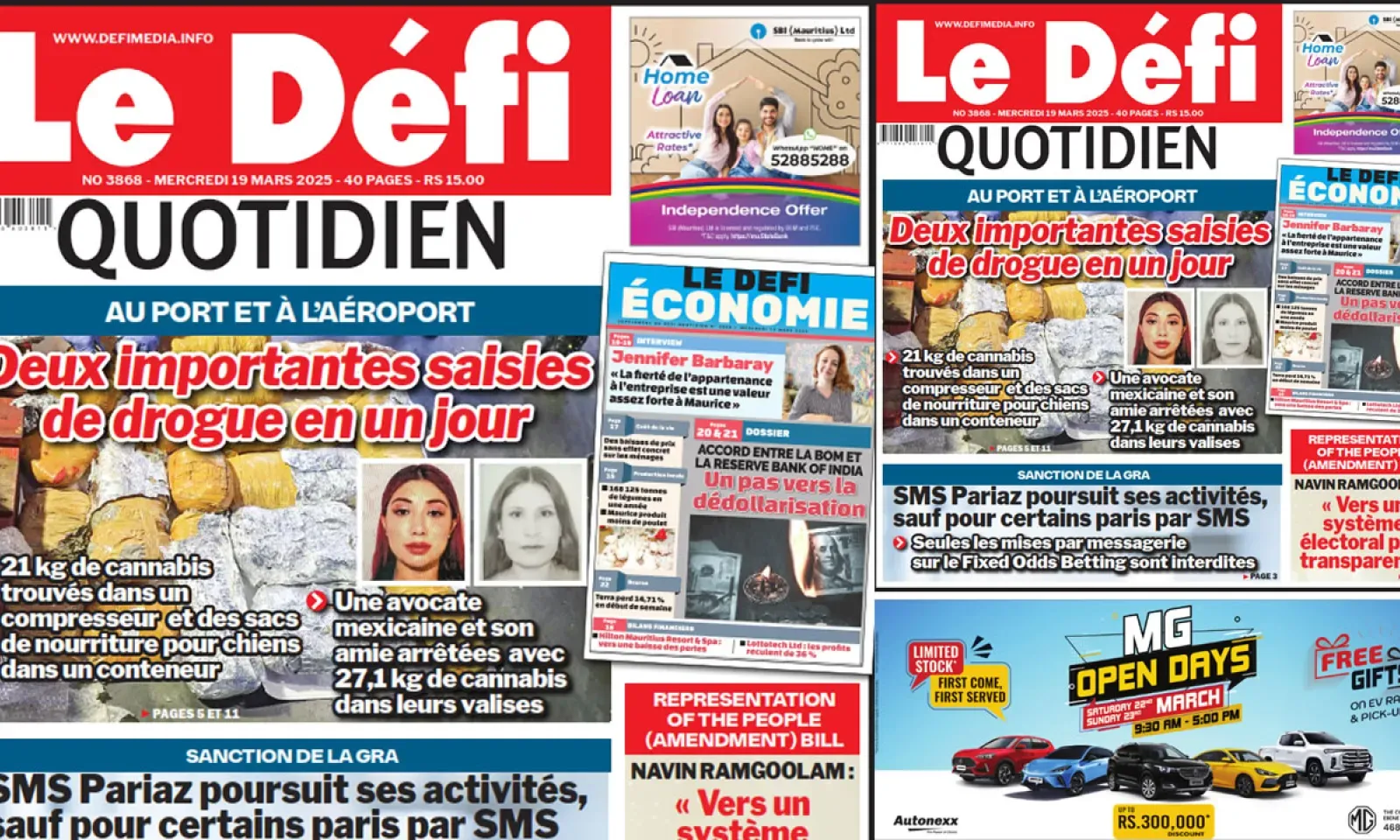 ? Voici la Une du Défi Quotidien. Le journal est en vente à Rs 15 l'exemplaire aux endroits habituels (supermarchés, boutiques, tabagies, superettes). Bonne lecture !