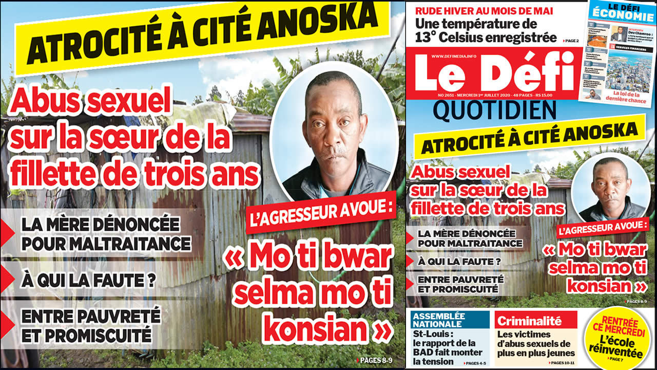 Le pays s’est à peine remis de la triste nouvelle d’une fillette de trois ans violée dimanche à Cité Anoska qu’il apprend, le mardi 30 juin 2020, que la sœur de cette dernière, âgée de neuf ans, a été victime d’une agression sexuelle. Son agresseur, Jesume Jean Marc Perrine, surnommé Yéyé et âgé de 47 ans, a avoué son crime. « Mo ti bwar selma mo ti konsian », a-t-il dit lors de son interrogatoire mardi après-midi. Ce planteur de légumes qui habite Cité Anoska sera inculpé devant le tribunal de Curepipe ce mercredi 1er juillet sous une accusation de « causing a child to be sexually abused ».