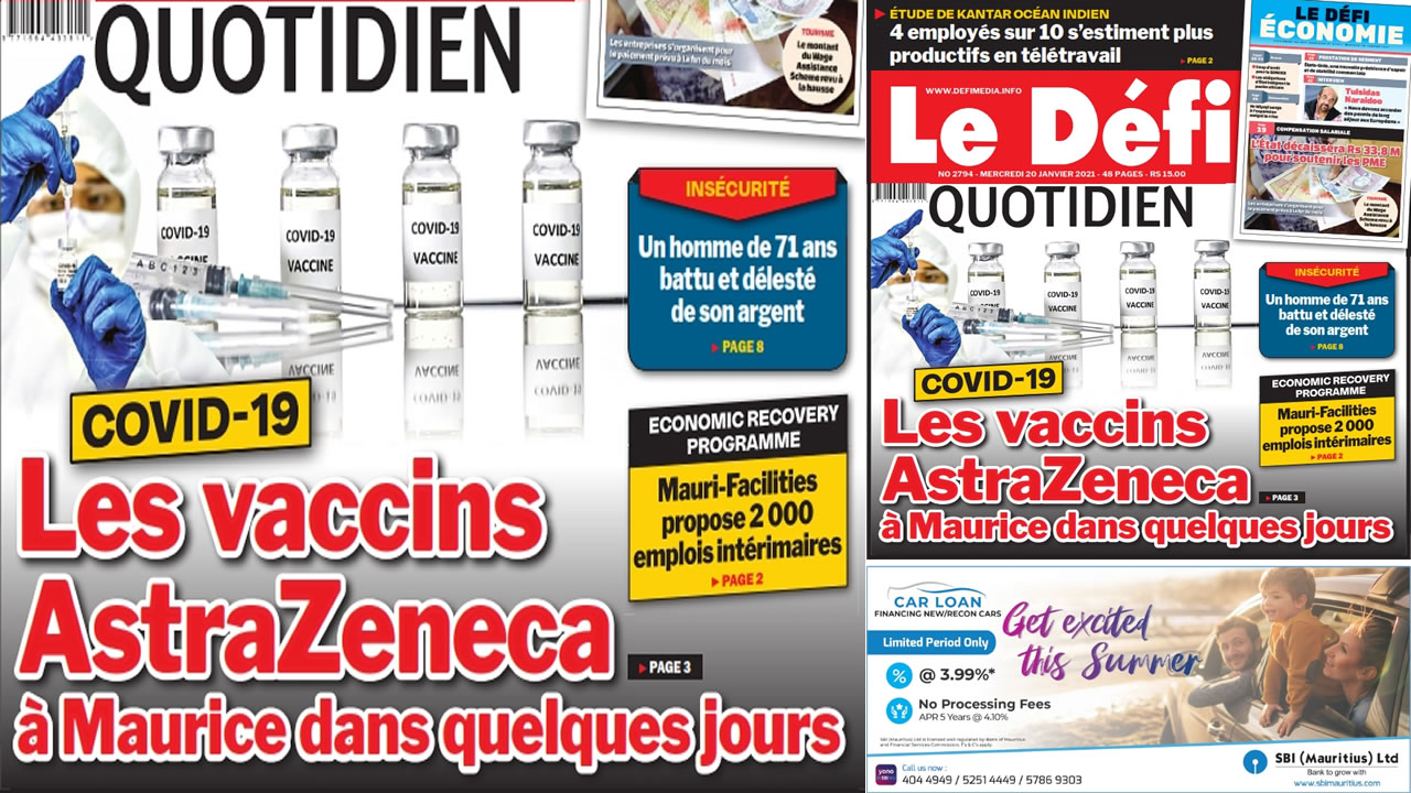 ? Voici la Une du Défi Quotidien. Le journal est en vente à Rs 15 l'exemplaire aux endroits habituels (supermarchés, boutiques, tabagies, superettes). Bonne lecture !