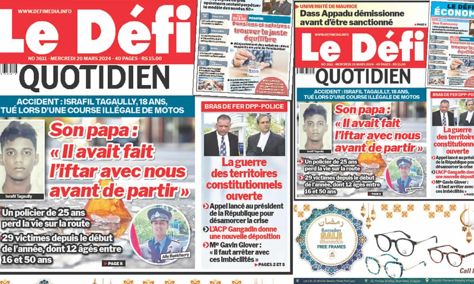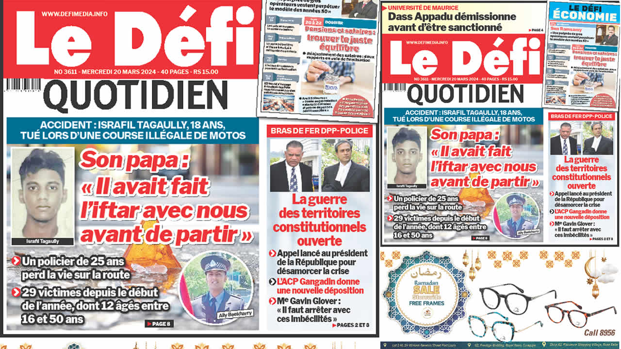 ? Voici la Une du Défi Quotidien. Le journal est en vente à Rs 15 l'exemplaire aux endroits habituels (supermarchés, boutiques, tabagies, superettes). Bonne lecture !