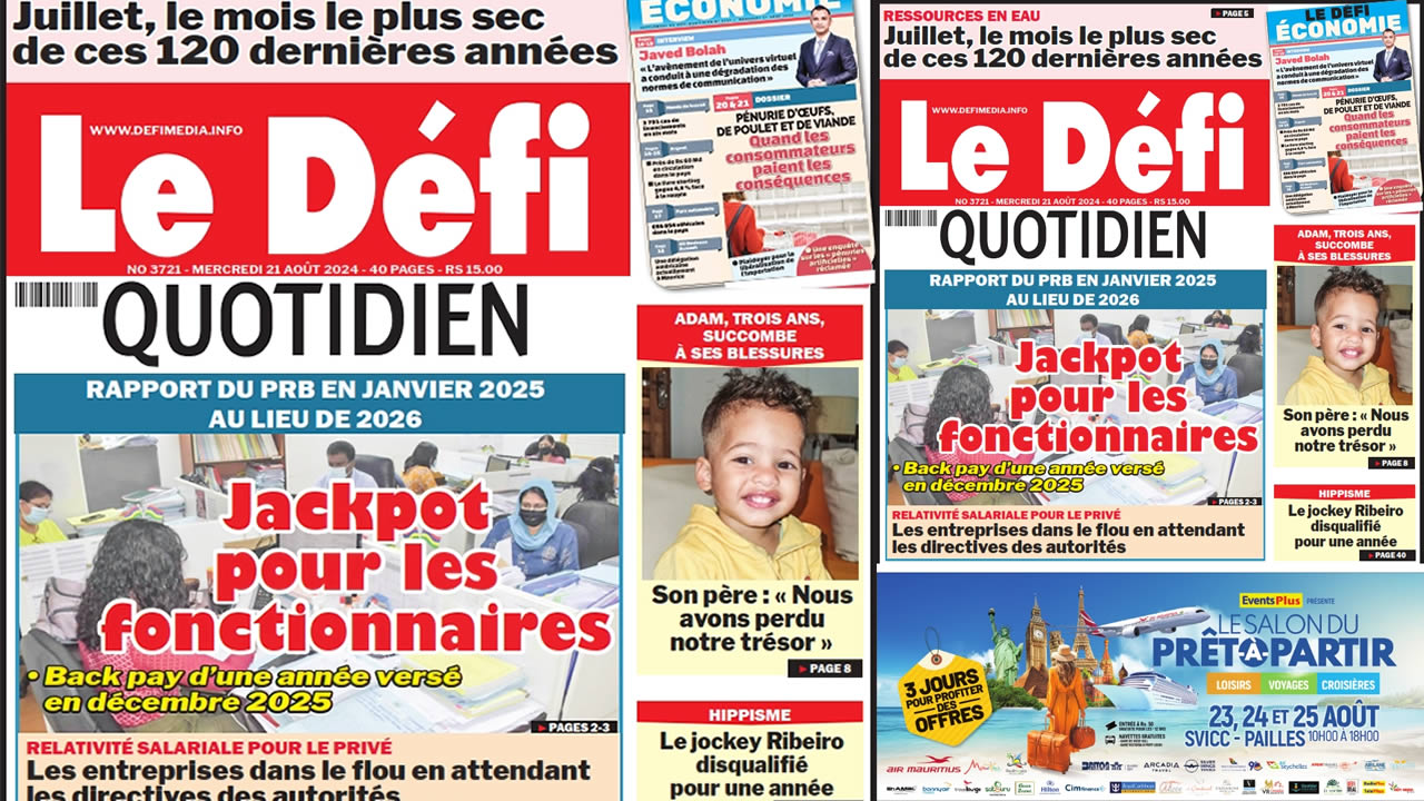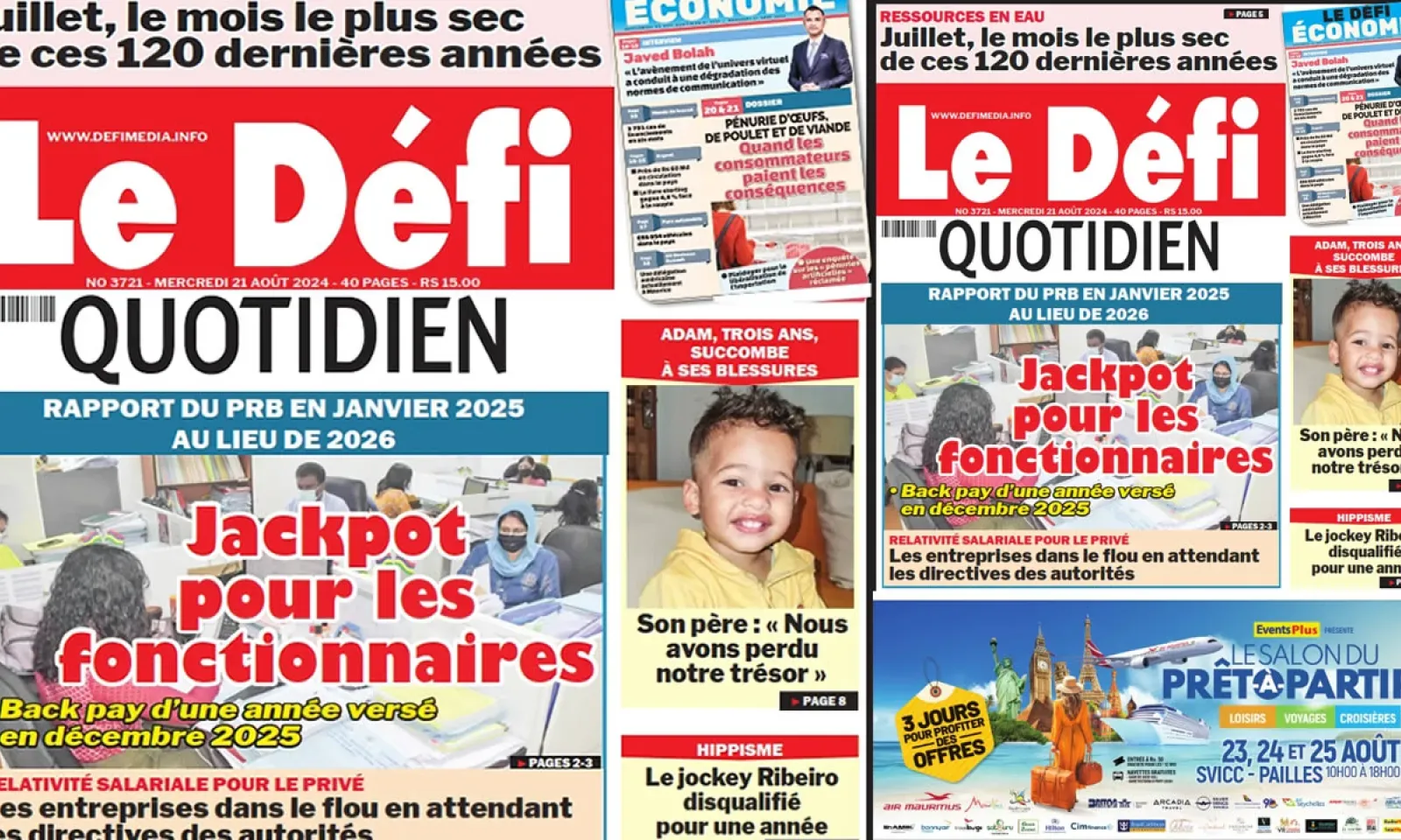 ? Voici la Une du Défi Quotidien. Le journal est en vente à Rs 15 l'exemplaire aux endroits habituels (supermarchés, boutiques, tabagies, superettes). Bonne lecture !