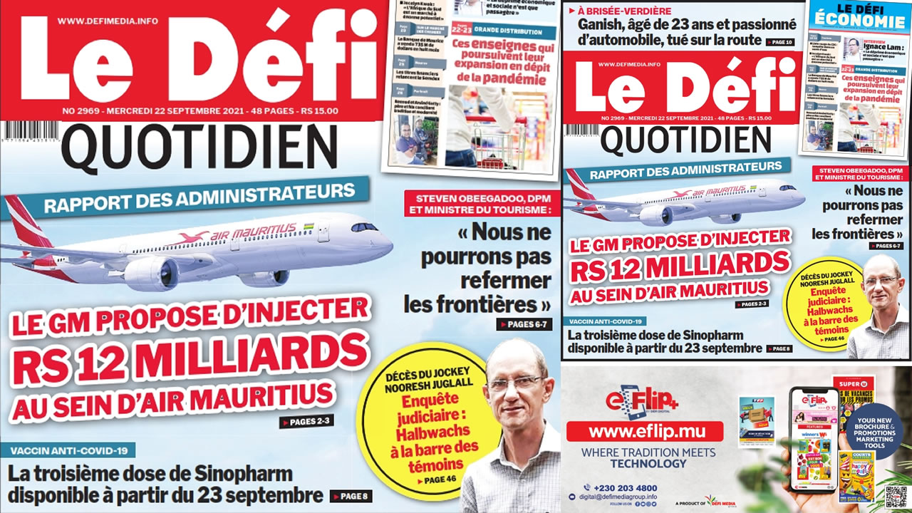 Le mardi 28 septembre 2021, les administrateurs d’Air Mauritius présenteront leur plan de redressement. Leur rapport, dont Le Défi Quotidien détient une copie, propose de sauver la compagnie grâce à une injection de Rs 9,5 milliards par l’État pour rembourser les créanciers et de Rs 2,5 milliards pour les dépenses d’Air Mauritius.